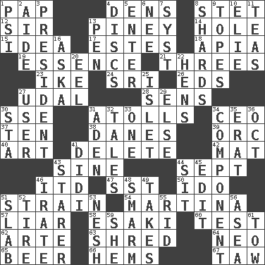 ACROSS 1. Infant food 4. Cub Scout units 8. Proofreading order 12. Title for a knight 13. Abounding in pines 14. Opening into or through something 15. The content of cognition 17. _____ Park, CO 18. Capital of Western Samoa 19. Gist 21. Trios 23. Mamie's mate 24. _ Lanka 26. Begley and Asner 27. Allodial 28. Elected reps. 30. Compass dir. 31. Ringlike coral islands and reefs 34. Corporate head (abbr.) 37. Nine, plus one 38. Natives or inhabitants of Denmark 39. The grampus (Milton) 40. Nonscientific branch of learning 41. Keyboard key 42. Floor protector 43. Trig term 44. Back-to-school mo. 46. It would 47. Fast jet (abbr.) 50. Wedding promise 51. Put through a sieve 54. Chrissie's court nemesis 57. One who doesn't tell the truth 58. 1973 Nobel Price Winner (Physics) Leo 60. Trial 62. Johnson of "Laugh-In" 63. Tear up 64. Modern: prefix 65. Fermented drink made from hops 66. Equivocates 67. The 23rd letter of the Hebrew alphabet DOWN 1. 23rd letter of the Greek alphabet 2. Assistant 3. Elected leader of a country 4. Flat circles 5. Keyboard key 6. Born 7. System (abbr.) 8. Broken pieces 9. Drinks excessively 10. Writer Wiesel 11. Beverages made from leaves 13. Fenced enclosure 16. "____ silly question..." 20. Snakelike fish 22. Coop moms 25. Small island 27. One who makes use of a thing 29. Otherwise 30. R.R. building 31. An important port of Yemen 32. Stories 33. Single 34. Part 35. Part of Q.E.F. 36. Sep. follower 41. "You Light Up My Life" star Conn 43. A viewer who gazes fixedly 44. Be seated 45. Prepare for publication 46. Feeling or showing extreme anger 48. Excessive but superficial compliments 49. Proceeds 51. Broad, flat, thick piece 52. Hoop that covers a wheel 53. Delicate 55. To free from 56. At sea 59. A female animal or person 61. Pull behind