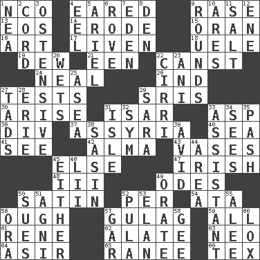 ACROSS 1. Non-commissioned officer (abbr.) 4. Having ears or earlike features 9. To erase 13. Greek goddess of the dawn 14. Eat (away) 15. NW Algerian seaport 16. Nonscientific branch of learning 17. Make or become more lively 18. Ubangi River tributary 19. Morning condensation 21. Car or cant ending 22. 2nd pers. sing. pres. of can (arch.) 24. Be tempered by heat 26. Indiana (abbr.) 27. Trials 29. Indian titles of respect 30. Ascend 31. Austrian river, tributary to the Danube 33. Viper 36. HTML Container Element 37. Nineveh was its capital 40. Ocean 41. Observe 42. _ mater 43. Flower holders 45. Otherwise 47. From or relating to Ireland 48. One more than two 49. Lyric poems 50. Smooth fabric 52. For each 54. _ moment's notice (2 wds.) 56. Ending for "Through" and "Enough" 57. Russian prison camp 59. 100% 61. French philosopher Descartes 62. Having winglike extensions 63. Modern: prefix 64. SW Saudi Arabia district 65. Indian princess (variant) 66. John Ritter's dad DOWN 1. Teachers' org. 2. Drawstring 3. Clearly or manifestly demonstrative 4. Snakelike fish 5. Satellite of Uranus 6. Be footloose 7. Locale of original sin 8. Lair 9. Periods in a boxing match 10. Ancient Greek god of war 11. Table seasoning 12. Compass dir. 20. Soaks 22. High-altitude cloud 23. Cuckoo 25. At sea 27. Small amounts or degrees 28. 4th largest of the Great Lakes 29. "Two Mules for Sister ____" 31. Capri or Wright 32. Symbol (abbr.) 33. Helper 34. Observes 35. Romantic infatuation 38. Indian antelope 39. Enthusiastic 44. Type of rug 45. One or the other of two 46. Cards in a Roman deck? 49. Speak pompously 50. Institutes legal proceedings 51. Hindu god of fire 52. Monetary unit of Botswana 53. Enthusiasm 55. Toward shelter 56. Mouth or opening 57. Slender fish 58. Unit of force equal to gravity 60. Brine-cured salmon