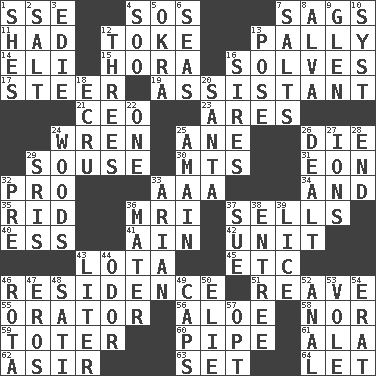ACROSS 1. Compass dir. 4. Mayday 7. Sinks 11. Possessed 12. Puff or smoke 13. Friendly 14. Connecticut Ivy Leaguer 15. Israeli folk dance 16. Finds the solution 17. Guide 19. Helper 21. Corporate head (abbr.) 23. Ancient Greek god of war 24. Songbird 25. A saturated hydrocarbon 26. Pass on 29. Lush 30. Mountains (abbr.) 31. A really long time 32. Adept person 33. American Automobile Association (abbr.) 34. Plus 35. To free from 36. Medical imaging device (abbr.) 37. Makes a sale 40. Double-curved letter 41. The 18th letter of the Arabic alphabet 42. A single undivided whole 43. Globular water bottle used in Asia 45. And so on (abbr.) 46. Home 51. Rob, plunder, or pillage 55. Speaker 56. Medicinal plant 58. Not either 59. Carrier 60. Corncob 61. Insect wing 62. SW Saudi Arabia district 63. Put into a specified state 64. Allow DOWN 1. "______ My Girl" (Turtles hit) 2. Table seasoning 3. Singer Brickell 4. "Barney Miller" actor Jack 5. Gumbo ingredient 6. Oceans 7. Table seasonings 8. Inventor's middle name 9. Small, secluded valley 10. System (abbr.) 12. Triads 13. Airs 16. Founders of families 18. Shade of tan 20. Before Barbara or Clara 22. Single 24. Forest 25. With great haste 26. Started a card game 27. Charged atoms 28. Conclusion 29. Indian titles of respect 32. Before (prefix) 33. Believer in; advocate of (suffix) 36. Mother 37. Institute legal proceedings 38. Main course 39. Louse (plural) 43. 61 cubic inches 44. Aroma 46. Round or rotation of duties 47. Greek god of love 48. Suttee (variant) 49. Smile enhancers 50. Writer Wiesel 52. Of or related to the anus 53. Grand slam 54. Part of Q.E.F. 57. Choose