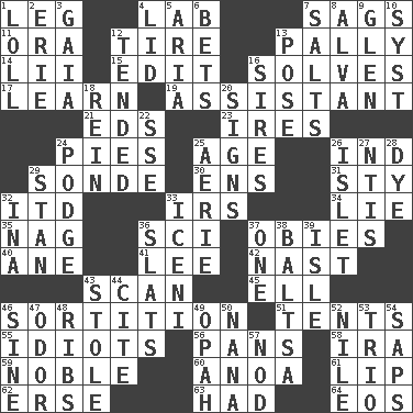 ACROSS 1. Part of a journey 4. Experiment locale 7. Droops 11. Mouth or opening 12. Become fatigued 13. Friendly 14. Cards in a Roman deck? 15. Prepare for publication 16. Finds the solution 17. Memorize 19. Helper 21. Begley and Asner 23. Angers 24. Sliced desserts 25. Grow older 26. Working for oneself (abbr.) 29. Something which is sent 30. Followers of ems 31. Filthy place 32. It would 33. Big collection agency 34. Whopper 35. Tired old horse 36. _-fi 37. Off-Broadway awards 40. A saturated hydrocarbon 41. Area sheltered from the wind 42. Political cartoonist Thomas 43. Skim 45. Pipe bend 46. Casting lots 51. Portable shelters 55. Foolish or stupid persons 56. Baking dishes 58. Retirement account (abbr.) 59. Impressive in appearance 60. Small Philippine buffalo 61. Mouth edge 62. Celtic language 63. Possessed 64. Greek goddess of the dawn DOWN 1. Hang loosely or laxly 2. 4th largest of the Great Lakes 3. Greek goddess of the earth (variant) 4. Flaplike covering 5. Operatic vocal solo 6. Wagers 7. Table seasonings 8. Inventor's middle name 9. Small, secluded valley 10. System (abbr.) 12. Watched over 13. Introduce or present, as a question 16. Fathers 18. It's straight from the horse's mouth 20. Public displays of written messages 22. Compass dir. 24. Puddle 25. Nest on high 26. Small island 27. Nuclear Threat Initiatives 28. Color 29. Comedian Laurel of Laurel & Hardy 32. _ tizzy (2 wds.) 33. Ancient Celtic tribe of eastern Britain 36. Narrow boards 37. Single 38. Greek mezzo-soprano Agnes 39. Small island 43. Took without asking 44. Quote 46. Trig term 47. Aroma 48. Teases 49. Brightly colored fish 50. Grandmother 52. Mediterranean tributary 53. Musical group of three 54. Plant excrements 57. Allow head to fall sleepily