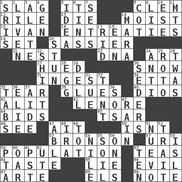 ACROSS 1. Volcanic refuse 5. ___ a Wonderful Life 8. Clement's nick name 12. Cause heat under the collar 13. Expire 14. Damp 15. _ the terrible 16. Pleas 19. Arrange properly for use 20. More lively and spirited 21. Egg locale 23. Heredity factor (abbr.) 24. Tate display 27. Became colored 30. Frozen precipitation 31. Eat 34. Singer James 35. Rend 38. Adhesives 40. "Vaya con ____" 41. Set down 42. Poe poem 44. Auction offers 45. Russian ruler of old 46. Perceive with the eye 47. Small island 50. Is not 53. "Death Wish" actor 57. RI univ. 59. Census information 63. Beverages made from leaves 64. Clothes sense 65. Untruth 66. Tending to cause great harm 67. Johnson of "Laugh-In" 68. Raised railways 69. Short letter DOWN 1. Indian titles of respect 2. Make or become more lively 3. Having winglike extensions 4. Commissioned mil. rank 5. The main thing one is thinking about 6. Airtight sealed metal containers 7. Arranges properly for use 8. Small bed 9. Cards in a Roman deck? 10. Compass dir. 11. Mountains (abbr.) 14. Hindu Mythology: god of death 17. To free from 18. Car or cant ending 20. Make senseless or dizzy 22. Upper-body garments 24. Opposed to 25. Printing process, for short 26. It was, poetically 28. Oval reproductive body of a fowl 29. Small valley 30. Spring feasts 32. Take to court 33. Portable shelter 35. Bar bills 36. Writer Wiesel 37. Assistant 39. Mayday 43. Precipitation 47. Competent 48. Retirement account (abbr.) 49. Small child 51. New (sp.) 52. Distinguishing feature 54. The longest river in the world 55. The visible part of the earth's surface 56. Singles 58. Small island 59. Parent Teacher Association (abbr.) 60. Rowing implement 61. Pacific Standard Time (abbr.) 62. Shoshoni 63. "___ Little Indians"