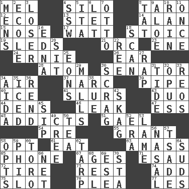 ACROSS 1. Cartoonist voice _ Blanc 4. Grain storage tower 8. Edible starchy tuberous root 12. Environmental prefix 13. Proofreading order 14. ____ Jay Lerner 15. Characteristic smell of wine 17. Electrical Unit 18. Unemotional 19. Bobsleighs 21. The grampus (Milton) 23. Compass dir. 24. Bert's buddy 26. Ewer handle 28. Tiny particle 30. Elected representative 34. Wind 37. Drug cop 39. Corncob 40. Frozen water 41. Disparaging remarks 43. Superhero pair 44. Hiding places for outlaws 46. Path through which fluid escapes 47. Double-curved letter 48. Inveterate users 51. Highlander 54. Before (prefix) 55. Let have 58. Elect 61. Consume 63. Collect or gather 65. Give a jingle 67. Ripens 71. He sold his birthright 72. Become fatigued 73. Repose 74. Increase 75. Groove 76. Entreaty 77. French article DOWN 1. Not women's 2. Learning spot: Fr. 3. Failure 4. Compass dir. 5. Call ___ day 6. Allow 7. Von Bismarck 8. Make lace 9. _ vera 10. Precipitation 11. Single time 16. Pulitzer Prize-winning author Ferber 18. Examine minutely or intensely 20. Be seated 22. To riddle 25. Immeasurably long periods of time 27. Strike 29. Shopping centers 30. Strangle with an iron collar 31. Event that recurs at intervals 32. Musical composition 33. Vintage cars 34. Opera by Verdi 35. On the rocks 36. Tear apart 38. Sorrow 42. Heroin 45. Small drink 49. Algonquian 50. Afternoon social gathering 52. Period 53. Unable to walk 56. Relating to the nose 57. Sadhe (variant) 58. Chooses 59. Silvers or Donahue 60. "Corrida" creature 62. Canvas cover 64. Soap bubbles 66. Fish or hair follower 68. Set 69. Compass dir. 70. R.R. building