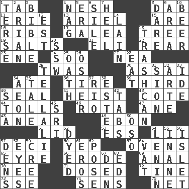 ACROSS 1. Keyboard key 4. Delicate 8. Small moist lump or mass 11. One of the Great Lakes 13. Satellite of Uranus 15. "We ___ not amused" (Victoria) 16. Chest bones 17. An organ shaped like a helmet 18. Relationship diagram 19. Table seasonings 21. Connecticut Ivy Leaguer 22. Posterior 23. Compass dir. 24. "Barney Miller" actor Jack 27. Teachers' org. 29. It was, poetically 30. Slender Brazilian palm 34. Had dinner 36. Become fatigued 39. One of three equal parts 40. Lick closed 41. Robbery 43. ____ d'Azur (French Riviera) 44. For Whom the Bell _____ 46. Round or rotation of duties 47. A saturated hydrocarbon 48. Approach 49. Inky black, to poets 51. Flaplike covering 53. Curvy letter 54. Cards in a Roman deck? 57. Tenth: prefix 60. Slangy assent 63. Baking chambers 65. Jane of fiction 66. Eat (away) 69. Of or related to the anus 70. Born 71. Administered medicine 72. Prong on a fork 73. Compass dir. 74. Elected reps. 75. Fish or hair follower DOWN 1. Laconic 2. Believer in; advocate of (suffix) 3. Instruction Manual for Humans 4. Tired old horse 5. Period 6. Drop; flow; fall 7. Person who is morally reprehensible 8. Have the gumption 9. Length times width 10. Fermented drink made from hops 12. Eastern Standard Time (abbr.) 14. (Had) reclined 18. File 13 20. Compass dir. 25. Pledge 26. Flexible twig of a willow tree 28. Consume 29. Copy Pinocchio 31. The Jewish people; Israel 32. Johnson of "Laugh-In" 33. Binary compound 34. A really long time 35. Lie 37. _ de Janeiro 38. First name in cosmetics 40. R.R. building 42. Bar bills 45. _ Lanka 50. Bear (Spanish) 52. Colored 54. Soviet premier 1918-24 55. Silly 56. Small island 57. Cub Scout units 58. Sight organs 59. Algonquian 61. Greek god of love 62. Airs 64. Large container 67. Lair 68. Begley and Asner