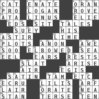 ACROSS 1. Domesticated feline 4. Related on the mother's side 9. NW Algerian seaport 13. Adept person 14. Utah city north of Ogden 15. Be footloose 16. "One Day ___ Time" 17. "_ and Lucy" (Charlie Brown theme song) 18. Writer Wiesel 19. Begley and Asner 21. Be seated 22. Lies 24. Chop _ 26. Part of HMS, perhaps 27. Having gotten out of bed 29. Welles in "The Third Man" 30. Schemes 31. Soon (poet.) 33. Deep reverence 36. "Barney Miller" actor Jack 37. Turned at an angle; bent 40. Ocean 41. Snakelike fish 42. Hearing organs 43. Musical pauses 45. Narrow board 47. Ascend 48. Wind 49. The front part of a cuirass 50. Smooth fabric 52. Scottish cap 54. And so on (abbr.) 56. Shade of tan 57. Ms. Damita and namesakes 59. Sandy's bark 61. Den 62. Speak pompously 63. Teachers' org. 64. Comedian Laurel of Laurel & Hardy 65. Laconic 66. "___ Little Indians" DOWN 1. Tax preparer (abbr.) 2. Johnson of "Laugh-In" 3. Inedible or poisonous agaric 4. Pipe bend 5. Annoyingly loud 6. Hindu god of fire 7. Strained 8. Followers of ems 9. Threatening words 10. Hero or heavy, e.g. 11. Deliberation 12. Born 20. Costume for a special activity 22. One or ones belonging to thee 23. Direct toward a target or goal 25. Celtic language 27. Domed church section 28. _ gin 29. Coldest temperatures 31. Blind as ____ 32. And not 33. Aide 34. Soaks 35. Comfort 38. Acquire or gain knowledge or skills 39. To draw with force 44. 4th largest of the Great Lakes 45. Titan orbits this 46. Cards in a Roman deck? 49. Sends forth 50. Get outta here! 51. Roberta Peters solo 52. Hoop that covers a wheel 53. Having or resembling wings 55. Algonquian 56. Raised railways 57. Car dealer's back yard 58. Perceive with the eye 60. Air blower