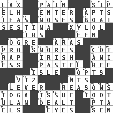 ACROSS 1. Not strict 4. Ache 8. Small drink 11. Shade tree 12. Keyboard key 14. Flats, for short 15. Beverages made from leaves 17. Olfactory organs 18. Water vessel 19. French poetic form 21. Xylene (variant) 23. Big collection agency 24. Car or cant ending 25. Legendary monster 27. Ancient river in northeast Turkey 30. Adept person 31. Sounds asleep 34. Small bed 37. Strike 38. From or relating to Ireland 39. Cuckoo 40. Curvy letter 41. Soft color 43. Portuguese money of account (variant) 44. Capri or Wright 45. Chooses 47. Namely 49. Mountains (abbr.) 50. Prying instrument 52. Thinks logically 56. Ancient Roman robe 57. Come out of 60. A blast of a horn 61. ____ Bator, Mongolia 62. Started a card game 63. Parent Teacher Association (abbr.) 64. Raised railways 65. Sight organs 66. Elected rep. DOWN 1. Allows 2. Toward shelter 3. Dec. holiday 4. Actor Sean's family 5. Small Philippine buffalo 6. ___ a Wonderful Life 7. Born 8. Soup utensil 9. Slanted text style (abbr.) 10. Pacific Standard Time (abbr.) 13. Acura sports coupe 14. Competent 16. Move through with a circular motion 20. Angers 22. It is so 25. Mouths or openings 26. Republicans 27. Originate 28. State of inaction 29. American tennis player Robert 30. Before (prefix) 32. Cuts off 33. Relating to the mouth 34. Draw slowly or heavily 35. Washington bills 36. Make a knot 42. Globular water bottle used in Asia 44. Ending with capital 46. Inconspicuous attention getter 47. Viva Las _ 48. "Terrible" tsar 49. Confronts 50. Hang loosely or laxly 51. To free from 52. Governing power 53. I made a mistake 54. Short letter 55. Comedian Laurel of Laurel & Hardy 56. Third day of the wk. 58. Perceive with the eye 59. Declare