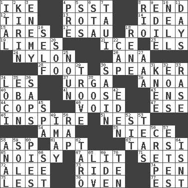ACROSS 1. Mamie's husband 4. Inconspicuous attention getter 8. Tear apart 12. Shallow baking pan 13. Round or rotation of duties 14. The content of cognition 15. Ancient Greek god of war 17. He sold his birthright 18. Turbulent 19. Citrus fruits 21. Frozen water 23. Raised railways 24. High-strength synthetic material 26. Santa ___, CA 28. 12 inches 30. Orator 34. French article 37. Capital and largest city of Mongolia 39. Small Philippine buffalo 40. Chief or king in Benin or Nigeria 41. Trap for birds or small mammals 43. Followers of ems 44. 911 reaches them 46. Empty area or space 47. Compass dir. 48. Stimulate to action 51. Egg locale 54. Housemaid (var.) 55. Sibling's daughter 58. Viper 61. Fitting 63. Tarsus (plural) 65. Annoyingly loud 67. Came down and settled, as after flight 71. Arranges properly for use 72. Toward shelter 73. Travel on or in a vehicle 74. Writing instrument 75. For fear that 76. Baking chamber 77. Eastern Standard Time (abbr.) DOWN 1. Slanted text style (abbr.) 2. Japanese brewing company 3. Foe 4. Before (prefix) 5. Distress signal 6. R.R. building 7. "Change" in Tahitian 8. _ de Janeiro 9. Singer Brickell 10. 1994 drama film starring Jodie Foster 11. 24-hour periods 16. Itself 18. French philosopher Descartes 20. "Barney Miller" actor Jack 22. Head covering 25. Part of speech 27. Auto club (abbr.) 29. Collection of objects 30. Indian antelope 31. Leg joint 32. Immeasurably long periods of time 33. Raze (variant) 34. Venues 35. Inky black, to poets 36. Plant excrements 38. Thick or sticky substance 42. Paradise 45. Health resort 49. "If ____ say so..." 50. Reproach for some lapse or misdeed 52. Be seated 53. Afternoon social gatherings 56. Streamer paper 57. _____ Park, CO 58. Of or related to the anus 59. Flatfish 60. Sliced desserts 62. Pacific island yam 64. Is not 66. Arrange properly for use 68. 54 in ancient Rome 69. Binary compound 70. "___ Little Indians"