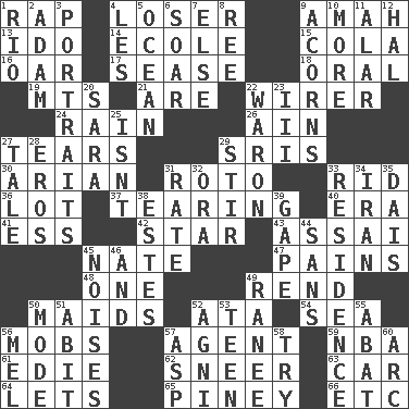 ACROSS 1. Hit sharply and swiftly 4. Failure 9. Wet nurse 13. Wedding promise 14. Learning spot: Fr. 15. Root beer relative 16. Boat paddle 17. Gospel singer Marvin 18. Taken by mouth 19. Mountains (abbr.) 21. "We ___ not amused" (Victoria) 22. One who wires 24. Precipitation 26. The 18th letter of the Arabic alphabet 27. Pulls apart 29. Indian titles of respect 30. Believer in; advocate of (suffix) 31. Printing process, for short 33. To free from 36. Car dealer's back yard 37. Pulling apart 40. Period 41. Curvy letter 42. Play the lead 43. Slender Brazilian palm 45. Nathan's nickname 47. Aches 48. Single 49. Tear apart 50. Women servants 52. _ moment's notice (2 wds.) 54. Ocean 56. Disorderly crowds 57. Representative 59. Basketball assoc. 61. Singer Brickell 62. Scornful expression 63. 4-wheeled motor vehicle 64. Allows 65. Abounding in pines 66. And so on (abbr.) DOWN 1. River (Sp.) 2. First of billions? 3. Likenesses of persons 4. French article 5. Sea 6. Fly high 7. Otherwise 8. To separate or throw off 9. Oak nuts 10. Greater amount 11. Having or resembling wings 12. Actor Linden 20. "Two Mules for Sister ____" 22. Make _____ (do battle with) 23. One more than two 25. Is not 27. Story 28. Greek god of love 29. Move through with a circular motion 31. Pace 32. Mouth or opening 33. Home 34. SW Asia republic 35. Raised platform 38. _____ Park, CO 39. Open wide 44. Without 45. Annoying sounds 46. Plus 49. Indian princess (variant) 50. Method 51. "This won't hurt ____!" 52. Hindu god of fire 53. Adolescent 55. Blind as ____ 56. Cartoonist voice _ Blanc 57. Viper 58. Attempt to accomplish something 60. Curve