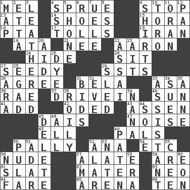ACROSS 1. Cartoonist voice _ Blanc 4. Upset 9. Cease 13. Had dinner 14. Imelda's hoard 15. Israeli folk dance 16. Parent Teacher Assoc. 17. For Whom the Bell _____ 18. SW Asia republic 19. "One Day ___ Time" 21. Born 22. Composer Copland 24. Flintstone garb 26. Be seated 27. Sleazy 29. Fast planes 30. Match 31. Actor Lugosi 33. White ___ sheet 36. Actress Charlotte 37. Popular '50s hangout 40. Player for Phoenix 41. Increase 42. Wrote a lyric poem 43. NE Netherlands city 45. Raised platform 47. Annoying sound 48. Pipe bend 49. Friends 50. Chummy 52. Santa ___, CA 54. And so on (abbr.) 56. Naked 57. Having winglike extensions 59. "We ___ not amused" (Victoria) 61. Narrow board 62. Mother 63. Modern: prefix 64. Conductor's collection 65. Sports stadium 66. Nine, plus one DOWN 1. Atlas unit 2. Singer James 3. Resembling or made to resemble leather 4. Fast jet (abbr.) 5. Give a jingle 6. Hero or heavy, e.g. 7. Ubangi River tributary 8. Double-curved letter 9. Upper-body garments 10. "Corrida" creature 11. Northwest Algerian city 12. Baking dish 20. Assistant 22. Slender Brazilian palm 23. Small island 25. Colored 27. "Two Mules for Sister ____" 28. Mild oath 29. Downhill vehicle 31. Auction offers 32. First lady 33. Helper 34. Takes to court 35. Singer Murray 38. Turbulent 39. Nanny 44. Not divided or shared with others 45. Keyboard key 46. Everything 49. Eucharist need 50. Monetary unit of Botswana 51. The sixth month of the Jewish calendar 52. Having or resembling wings 53. Nathan's nickname 55. Algonquian 56. Science/research agcy. 57. Housemaid (var.) 58. Epoch 60. Period of immesurable duration