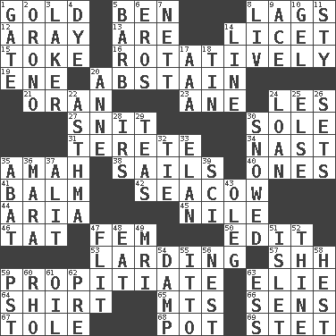 ACROSS 1. Aureate 5. Benjamin's nick name 8. Straggles 12. Like ___ of sunshine 13. "We ___ not amused" (Victoria) 14. It is permitted: Lat. 15. Puff or smoke 16. Rotating or pertaining to rotation 19. Compass dir. 20. Choose not to consume 21. NW Algerian seaport 23. A saturated hydrocarbon 24. French article 27. In a ____ (agitated or irritated) 30. Flatfish 31. Cylindrical with tapered ends 34. Political cartoonist Thomas 35. Nursemaid 38. Travel by water 40. Washington bills 41. Lip ointment 42. Manatee 44. Roberta Peters solo 45. Mediterranean tributary 46. Make lace 47. Opposite of masc. 50. Prepare for publication 53. Preparing or cooking with lard 57. Quiet! 59. Appease 63. Writer Wiesel 64. Upper-body garment 65. Mountains (abbr.) 66. Elected reps. 67. Lacquered or enameled metalware 68. Cooking vessel 69. Proofreading order DOWN 1. Yard entry 2. U. of Maine site 3. Member of a famous L.A. basketball team 4. Color 5. Sharp remark 6. Greek god of love 7. Remaining after all deductions 8. 54 in ancient Rome 9. Adept person 10. Set 11. Filthy place 14. Actor's bit 17. American Automobile Association (abbr.) 18. Metal container 20. Singer Murray 22. Respiratory problem 24. Grant temporary use of 25. Otherwise 26. Puts into a specified state 28. Big collection agency 29. Beverages made from leaves 30. Frozen precipiation fell 32. Make a knot 33. Enthusiasm 35. Blind as ____ 36. Hindu Mythology: god of death 37. Set down 39. _-fi 43. Cassini of fashion 47. Sudden quick movement 48. Ingest 49. Medical imaging device (abbr.) 51. Small island 52. One or ones belonging to thee 54. Moist 55. "Tell ____ the Marines!" 56. A home for chicks 58. Behest 59. Pacific Standard Time (abbr.) 60. 17th letter of the Greek alphabet 61. Lubricate 62. Before (prefix) 63. Double-curved letter