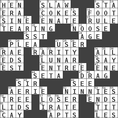 ACROSS 1. Layer 4. Cole _ (cabbage dish) 8. R.R. building 11. Period 12. Popular sodas 14. 12 inches 15. Trig term 17. Related on the mother's side 18. General guideline 19. Rending 21. Trap for birds or small mammals 23. Fast jet (abbr.) 24. Ripen 25. Entreaty 27. One who uses or employs something 30. Actress Charlotte 31. Noteworthy scarcity 34. 100% 37. Begley and Asner 38. Type of eclipse 39. Declare 40. Eastern Standard Time (abbr.) 41. Main course 43. Compass dir. 44. Bristle 45. To trail on the ground 47. Title for a knight 49. Perceive with the eye 50. Nest on high 52. Simpletons 56. Relationship diagram 57. Failure 60. Extremities 61. Flaplike coverings 62. Feeling or showing extreme anger 63. Teat (slang) 64. Island 65. Flats, for short 66. French article DOWN 1. Command 2. One of the Great Lakes 3. Nanny 4. Aroma 5. Protracted 6. Alias (abbr.) 7. Dripping 8. Lush 9. Lacquered or enameled metalware 10. Had dinner 13. Elected rep. 14. Toadlike animal 16. Celtic language 20. Austrian river, tributary to the Danube 22. Rowing implement 25. Groovy apts. 26. For fear that 27. National forest in Provo, Utah 28. Play the lead 29. Jane of fiction 30. Portuguese money of account (variant) 32. Toward shelter 33. Undersized animal 34. Toward the sea 35. Austrian-born American filmmaker Fritz 36. Sodium hydroxide 42. Paradise 44. Indian title of respect (Mr.) 46. French philosopher Descartes 47. Sleazy 48. Angers 49. Titles for men of rank and authority 50. Roberta Peters solo 51. Connecticut Ivy Leaguer 52. Remaining after all deductions 53. International (abbr.) 54. Singer Brickell 55. Fast planes 56. Affectionate concern, for short 58. Mouth or opening 59. Plant excrement