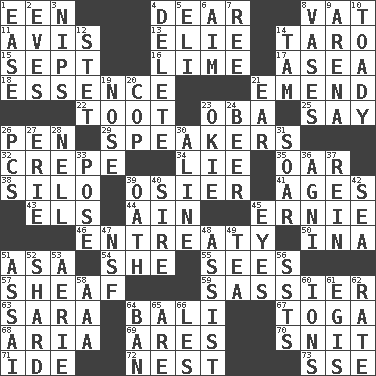 ACROSS 1. Car or cant ending 4. Letter starter 8. Large container 11. Deliberation 13. Writer Wiesel 14. Pacific island yam 15. Back-to-school mo. 16. Welles in "The Third Man" 17. Toward the sea 18. Core 21. Make improvements or corrections to 22. A blast of a horn 23. Chief or king in Benin or Nigeria 25. Declare 26. Fenced enclosure 29. Orators 32. Streamer paper 34. Falsehood 35. Boat paddle 38. Grain storage tower 39. Flexible twig of a willow tree 41. Eons 43. Raised railways 44. The 18th letter of the Arabic alphabet 45. Bert's buddy 46. Plea 50. _ tizzy (2 wds.) 51. White ___ sheet 54. A female animal or person 55. Perceives with the eye 57. Archer's quiver 59. More impudent 63. "Two Mules for Sister ____" 64. Indonesian resort city 67. Ancient Roman robe 68. Operatic vocal solo 69. Ancient Greek god of war 70. In a ____ (agitated or irritated) 71. Binary compound 72. A home for chicks 73. Compass dir. DOWN 1. Comfort 2. Nights before holidays 3. Cuts off 4. Keyboard key 5. Biblical high priest 6. Direct toward a target or goal 7. To separate or throw off 8. Flower holders 9. Sports stadium 10. Sycophant 12. Proofreading order 14. Scottish cap 19. Characteristic smell of wine 20. Police officer (slang) 21. Hearing organ 23. Migrant worker of the '30s 24. Fermented drink made from hops 26. Personal Computers (abbr.) 27. One of the Great Lakes 28. 1994 drama film starring Jodie Foster 30. Place in a line 31. Fly high 33. Introduce or present, as a question 36. Hindu god of fire 37. It's straight from the horse's mouth 39. Pledge 40. Father 42. Ocean 45. Sight organs 47. Overdraft (abbr.) 48. Help 49. Beverage made from leaves 51. Slender Brazilian palm 52. Pottery fragment 53. Nest on high 56. Fast planes 58. American Automobile Association (abbr.) 60. Charged atoms 61. Armor plate that protects the chest 62. Assign a rank or rating to 64. Prohibit 65. "We ___ not amused" (Victoria) 66. French article
