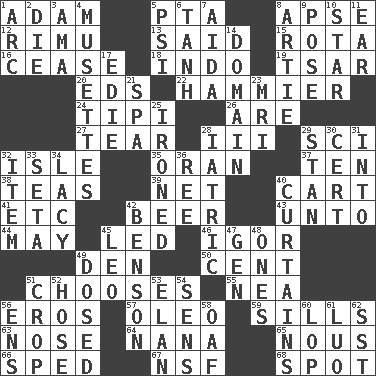 ACROSS 1. First of billions? 5. Parent Teacher Association (abbr.) 8. Domed church section 12. Tall New Zealand timber tree 13. Alleged 15. Roll call or roster of names 16. Stop 18. _ china 19. Russian ruler of old 20. Begley and Asner 22. More overdramatic by comparison 24. Native american tent (variation) 26. "We ___ not amused" (Victoria) 27. Pull into pieces 28. One more than two 29. _-fi 32. Small island 35. NW Algerian seaport 37. Nine, plus one 38. Beverages made from leaves 39. Fish or hair follower 40. Heavy open wagon 41. And so on (abbr.) 42. Fermented drink made from hops 43. To (old English) 44. Fifth month 45. Directed 46. Russian composer Stravinsky 49. Lair 50. Penny 51. Opts 55. Teachers' org. 56. Greek god of love 57. Butter sub 59. Beverly of Met fame 63. Olfactory organ 64. Nanny 65. Good sense 66. Drove too fast 67. Science/research agcy. 68. Blemish DOWN 1. Curve 2. Expire 3. Housemaid (var.) 4. French bagpipes 5. 23rd letter of the Greek alphabet 6. Hyperbolic tangent 7. Opera by Verdi 8. Nick name for Arthur 9. Airs 10. Play the lead 11. Hearing organ 14. Kingdom 17. Singer Brickell 21. Health resort 23. Medical imaging device (abbr.) 25. Pressed 28. Of or pertaining to medicine 29. Comedian Laurel of Laurel & Hardy 30. An absolute certainty 31. To the inside or interior of 32. Detail 33. Bristle 34. Made of lace 36. To separate or throw off 40. Window treatments 42. Gillaume's butler role 45. Lion 47. Commissioned military rank (abbr.) 48. Singles 49. Administered medicine 51. Riding implement 52. Stockings 53. Enthusiasm 54. Elected reps. 56. Followers of ems 58. Clumsy lout 60. Trim (branches) 61. Nilotic language 62. Fast jet (abbr.)