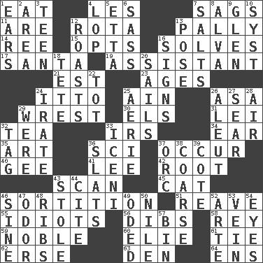 ACROSS 1. Consume 4. French article 7. Sinks 11. "We ___ not amused" (Victoria) 12. Roll call or roster of names 13. Chummy 14. To separate or throw off 15. Elects 16. Finds the solution 17. Before Barbara or Clara 19. Helper 21. Eastern Standard Time (abbr.) 23. Ripens 24. "Tell ____ the Marines!" 25. The 18th letter of the Arabic alphabet 26. White ___ sheet 29. Obtain by seizing forcibly or violently 30. Raised railways 31. Flowery wreath 32. Afternoon social gathering 33. Big collection agency 34. Hearing organ 35. Tate display 36. _-fi 37. Come to pass 40. Turn to the right 41. Area sheltered from the wind 42. Carrot, for example 43. Examine hastily 45. Feline 46. Making a chance decision by using lots 51. Rob, plunder, or pillage 55. Foolish or stupid persons 56. Claim 58. Marina Del _, California 59. Having high moral qualities 60. Writer Wiesel 61. Standoff 62. Celtic language 63. Lair 64. Followers of ems DOWN 1. Hearing organs 2. Length times width 3. Adolescent 4. Trim (branches) 5. Singer James 6. Backtalk 7. Table seasonings 8. Inventor's middle name 9. Small, secluded valley 10. System (abbr.) 12. Cooks with dry heat, as in an oven 13. Introduce or present, as a question 16. Attaches a signature 18. Wig 20. Moves on water 22. Small child 24. Feeling or showing extreme anger 25. Nest on high 26. Eskimo relative 27. Burn superficially 28. Atmosphere 29. We are 32. Label 33. Ancient Celtic tribe of eastern Britain 36. Narrow boards 37. The grampus (Milton) 38. Unrefined 39. ____ d'Azur (French Riviera) 43. Took without asking 44. Quote 46. Trig term 47. Aroma 48. Chest bones 49. Wrote a lyric poem 50. "Death on the ____" 52. Johnson of "Laugh-In" 53. Distinctive style or manner 54. Snake ____ (dice throw) 57. Storage container