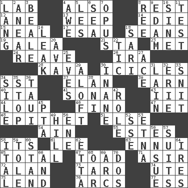 ACROSS 1. Experiment locale 4. In addition 8. Take ten 12. A saturated hydrocarbon 13. Shed a tear 14. Singer Brickell 15. Anneal 17. Son of Isaac 18. Actors Connery and Penn 19. An organ shaped like a helmet 21. R.R. building 23. Was introduced to 24. Break or tear apart 26. Retirement account (abbr.) 28. Polynesian shrub of the pepper family 30. Winter's stalactites 34. Fast jet (abbr.) 37. Flair 39. Merit 40. Call ___ day 41. Echolocation 43. One more than two 44. Central Nebraska county 46. A pale, very dry sherry 47. Fish or hair follower 48. Curse 51. Otherwise 54. The 18th letter of the Arabic alphabet 55. _____ Park, CO 58. ___ a Wonderful Life 61. Area sheltered from the wind 63. World-weariness 65. Add up to 67. Frog relative 71. SW Saudi Arabia district 72. ____ Jay Lerner 73. Pacific island yam 74. Shoshoni 75. Grant temporary use of 76. Curves 77. Double-curved letter DOWN 1. Austrian-born American filmmaker Fritz 2. Approach 3. Calif. Air Force Base 4. Deep reverence 5. French article 6. Ocean 7. Musical composition 8. To sift 9. Dutch treat 10. Trig term 11. Trial 16. Path through which fluid escapes 18. Indian skirt 20. Actress Gardner 22. Nervous spasm 25. Nights before holidays 27. Adept person 29. At or to great height 30. Empty; void 31. (Had) reclined 32. 4th largest of the Great Lakes 33. In a ____ (agitated or irritated) 34. Filth; sediment 35. Constrict 36. "Change" in Tahitian 38. Black tropical American cuckoo 42. Hero or heavy, e.g. 45. Parent Teacher Assoc. 49. Land elevation 50. Compass dir. 52. Compass dir. 53. Inactive volcano in Sicily 56. Follow as a consequence or result 57. Sets or collections 58. Slanted text style (abbr.) 59. Lacquered or enameled metalware 60. Comedian Laurel of Laurel & Hardy 62. Singer James 64. Angers 66. Plus 68. Boat paddle 69. Curve 70. Two (Sp.)