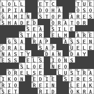 ACROSS 1. Hang loosely or laxly 5. And so on (abbr.) 8. Third day of the wk. 11. Capital of Western Samoa 12. Capital of the state of Qatar 14. Bear (Spanish) 15. Street urchin 17. Discontinue 18. Ancient Greek god of war 19. Cast a shadow over 21. Speaker 23. Ocean 25. Drop; flow; fall 26. Play the lead 27. Shade tree 28. "We ___ not amused" (Victoria) 31. Girls' org. (abbr.) 33. Strike 35. NE Netherlands city 37. Taken by mouth 38. Plant excrement 40. Ubangi River tributary 41. Difficult 43. One of the 12 tribes of Israel 45. 24 hours 46. Curvy letter 47. Raised railways 50. Charged atoms 52. _ gin 53. Modern: prefix 54. Threatening words 56. A period of five years 61. Visual representation of an object 62. Singer Brickell 65. Begets 66. _ de Janeiro 67. It's straight from the horse's mouth 68. Path through which fluid escapes 69. Put into a specified state 70. To free from 71. Gumbo ingredient DOWN 1. Straggles 2. Brightly colored fish 3. Pale green bean 4. Put down 5. Begley and Asner 6. Small child 7. Opt 8. "Corrida" creature 9. One who uses or employs something 10. Greek goddess of the dawn 13. Showery time 16. A home for chicks 18. Had dinner 20. Letter starter 22. _ mater 24. Caspian sea tributary 26. Table seasoning 28. Toward the sea 29. Have confidence or faith in 30. Compass dir. 31. Pate de foie ____ 32. Backtalk 34. Groovy apt. 36. Beer foam 37. Single 39. Ache 42. Shout 44. Christmas carol 48. Failure 49. Sowing specialist 51. Good sense 52. Elected rep. 54. Migrant worker of the '30s 55. Carrot, for example 57. Grain storage tower 58. Long journey 59. Located in or toward the back 60. "____ silly question..." 61. Big collection agency 63. One more than two 64. Conclusion