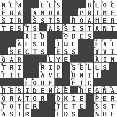 ACROSS 1. ___ Haven, CT 4. Raised railways 7. Group of countries in special alliance 11. Epoch 12. Small Philippine buffalo 13. A-one 14. Title for a knight 15. Fast planes 16. Nomad 17. Trials 19. Aide 21. Help 23. Lyric poems 24. In addition 25. Third day of the wk. 26. Consume 29. Religious groups 30. Curvy letter 31. 16 32. Boat paddle 33. Potassium hydroxide 34. The 18th letter of the Arabic alphabet 35. Three (prefix) 36. To free from 37. Makes a sale 40. Make a knot 41. "___ Maria" 42. A single undivided whole 43. Old wives' tales, e.g. 45. And so on (abbr.) 46. Dwelling 51. Canadian anthropologist Darnell 55. Speaker 56. Migrant worker of the '30s 58. For each 59. Carrier 60. Wig 61. Fast jet (abbr.) 62. SW Saudi Arabia district 63. Begley and Asner 64. A female animal or person DOWN 1. Egg locale 2. 4th largest of the Great Lakes 3. Armed conflicts 4. Followers of ems 5. Globular water bottle used in Asia 6. Backtalk 7. Naughty children 8. Pale green bean 9. Presage 10. Sure thing 12. Help 13. Introduce or present, as a question 16. Amusement-park features 18. Baby powder 20. Lush 22. Two (Sp.) 24. Nest on high 25. Miss Universe 1986, Barbara Palacios _ 26. Honor 27. Opinion 28. Shallow baking pan 29. Indian skirt 32. Baseball player Mel 33. Make or become more lively 36. Less widely known 37. Take to court 38. Main course 39. Louse (plural) 43. 61 cubic inches 44. Scent 46. Roll call or roster of names 47. Greek god of love 48. Suttee (variant) 49. ____ d'Azur (French Riviera) 50. Made supply last 52. Global Positioning Systems (abbr.) 53. Soft 54. Johnson of "Laugh-In" 57. It is