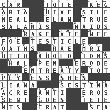 ACROSS 1. Auto 4. Lug 8. Barrel 11. Roberta Peters solo 13. Hub of activity 14. Drop; flow; fall 15. Welt 16. Style 17. Loyal 18. Deli grouping 21. Unmarried girls 22. Libertine 23. Compete 25. Born 26. Enemy 29. A testis 32. Curses 34. Actress Charlotte 35. Medical imaging device (abbr.) 38. Von Bismarck 39. Hold, grip (Informal) 41. Charged atoms 43. Actor Linden 44. Animal enclosure 45. Eat (away) 46. Plea 50. Small child 51. Strand of rope, yarn or thread 54. Double-curved letter 55. "______ My Girl" (Turtles hit) 57. Climbing, woody, usually tropical vines 59. French poetic form 63. 1/640 square mile 64. Against 67. Greek god of love 68. Transmitted 69. Moves 70. False hair 71. Mountains (abbr.) 72. Part of Q.E.F. 73. Ocean DOWN 1. Crow sounds 2. Length times width 3. Monetary unit of Yemen 4. College papers 5. Lubricate 6. Federal power corp. 7. Car or cant ending 8. Japanese brewing company 9. Evade 10. Honkers 12. Having or resembling wings 14. R.R. building 19. Floor coverings 20. Mamie's mate 21. Cartoonist voice _ Blanc 23. Small bottle 24. On the rocks 26. Egg _ yung 27. Pledge 28. Singer James 30. Marketplace scale 31. Arab leader 33. Opening into or through something 36. Carrot, for example 37. Southeast Asian peninsula 39. Tenement units (abbr.) 40. Possessive pronoun 42. Arrange properly for use 45. Snake ____ (dice throw) 47. Teachers' org. 48. Aid 49. Definite Article 51. Suffix with ecto or cyto 52. It is permitted: Lat. 53. Entertaining tales 56. Proofreading order 58. Fish or hair follower 60. Angers 61. Short letter 62. At sea 64. Personal question 65. Not either 66. Afternoon social gathering