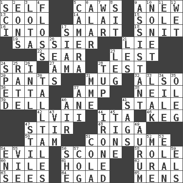 ACROSS 1. Automatic 5. Crow sounds 9. Afresh 13. Calm and collected 14. Jai ____ 15. Flatfish 16. To the inside or interior of 17. Don Adams' spy role 18. In a ____ (agitated or irritated) 19. More disrespectful 21. Whopper 22. Shrivel 23. For fear that 24. _ Lanka 27. Housemaid (var.) 28. Trial 29. Leg coverings 31. Java container 32. In addition 36. Singer James 37. Electrical Unit 38. Famous astronaut Armstrong 39. Small valley 40. A saturated hydrocarbon 41. Having lost freshness 42. 57 in ancient Rome 44. Call ___ day 46. Barrel 47. Tumult 48. Port city in Latvia 50. Scottish cap 51. Ingest 54. Morally bad or wrong 56. Biscuitlike quick bread 58. Hero or heavy, e.g. 60. The longest river in the world 61. Hollow 62. Mountain range 63. Observes 64. Mild oath 65. Not women's DOWN 1. _-fi 2. Immeasurably long periods of time 3. Globular water bottle used in Asia 4. Soft thread for cleaning between teeth 5. Device for capturing images 6. Having or resembling wings 7. Armed conflict 8. Be seated 9. Aide 10. Music written for nine 11. Connecticut Ivy Leaguer 12. Dripping 17. Thailand, formerly 20. Oceans 21. French article 23. Part of a journey 24. Broke a traffic law 25. Assign a rank or rating to 26. International (abbr.) 28. Uncastrated adult male sheep 30. Baron Munchausen's specialties 31. Madame (abbr.) 33. Path through which fluid escapes 34. Filth; sediment 35. Cassini of fashion 37. Black tropical American cuckoo 40. Wind 41. Settles 43. Zeal 44. Pressed 45. Prong on a fork 47. Vertical member of a panel or frame 49. Gold (Symbol: Au) 51. Root beer relative 52. Greater amount 53. Enthusiasm 54. Followers of ems 55. Compete 56. A female animal or person 57. Gear tooth 59. Raised railways