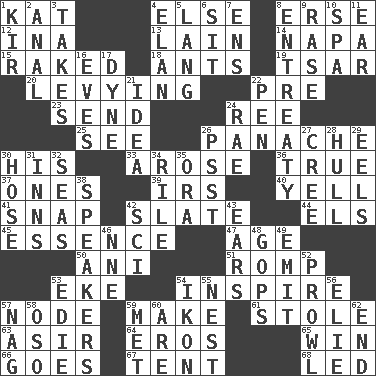 ACROSS 1. Krazy ___ of comics 4. Otherwise 8. Celtic language 12. _ tizzy (2 wds.) 13. (Had) reclined 14. California wine valley 15. Moved through 18. Pismires 19. Russian ruler of old 20. Imposing or collecting, as a tax 22. Before (prefix) 23. Post 24. Portuguese money of account (variant) 25. Observe 26. Flamboyance 30. Part of HMS, perhaps 33. Came up 36. Loyal 37. Washington bills 39. Big collection agency 40. Shout 41. Fastener 42. Chalkboard 44. Raised railways 45. Core 47. Ripen 50. Cuckoo 51. Frolic 53. Supplement with great effort 54. Stimulate to action 57. Thickened enlargement 59. Cause to be 61. Took without asking 63. SW Saudi Arabia district 64. Greek god of love 65. Victory 66. Leaves 67. Portable shelter 68. Directed DOWN 1. Apertif with cassis 2. Of or related to the anus 3. Proceeds 4. Flair 5. Austrian-born American filmmaker Fritz 6. Be seated 7. Followers of ems 8. Plea 9. Raze (variant) 10. Health resort 11. Ewer handle 16. Nights before holidays 17. Centimeter-gram-second unit of force 21. The content of cognition 22. Fenced enclosure 24. Actress Charlotte 26. Inconspicuous attention getter 27. Algonquian 28. Frame or body of a ship 29. Snakelike fish 30. Flexible conduit 31. Taverns 32. Oceans 34. Cause heat under the collar 35. Mouth or opening 38. Orators 42. _-fi 43. Hearing organs 46. Compass dir. 48. Republicans 49. Give off 52. Move like a hungry wolf 53. Singer Brickell 54. Image 55. Egg locale 56. Writer Wiesel 57. Tired old horse 58. Bear (Spanish) 59. Was introduced to 60. "We ___ not amused" (Victoria) 62. Conclude