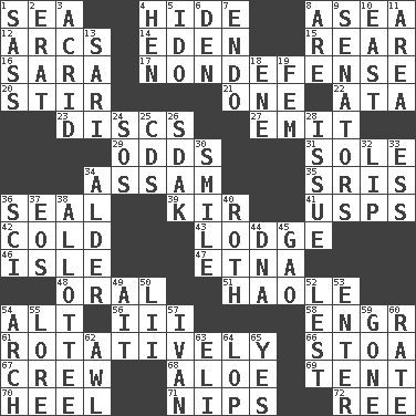 ACROSS 1. Ocean 4. Flintstone garb 8. At sea 12. Curves 14. Locale of original sin 15. Located in or toward the back 16. "Two Mules for Sister ____" 17. Unrelated to defense, as in spending 20. Disorderly outburst 21. Single 22. _ moment's notice (2 wds.) 23. Plates 27. Send forth 29. Likelihood 31. Flatfish 34. Indian state 35. Indian titles of respect 36. Lick closed 39. Apertif with cassis 41. United States Postal Service (abbr.) 42. Lacking warmth 43. Inn 46. Capri or Wright 47. Inactive volcano in Sicily 48. Of the mouth 51. White Person, in Hawaii 54. The first octave above the treble staff 56. One more than two 58. Engineer (abbr.) 61. Rotating or pertaining to rotation 66. Portico 67. Ship's personnel 68. Medicinal plant 69. Portable shelter 70. Person who is morally reprehensible 71. Cuts off 72. To separate or throw off DOWN 1. Backtalk 2. Part of Q.E.F. 3. Sour-tasting 4. Layer 5. Wedding promise 6. Lair 7. Inside; within (prefix) 8. "We ___ not amused" (Victoria) 9. Elected representatives 10. 90 degrees 11. Type of rug 13. Indian skirt 18. Compass dir. 19. Opposite of masc. 24. Mayday 25. Music discs 26. Neighbor of Neb. 28. Come out of 30. Grin 32. Mouth edge 33. Double-curved letter 34. Tree or shrub in the Birch family 36. _-fi 37. Greek goddess of the dawn 38. One to whom something is allotted 40. Writer of Portnoy's Complaint (1969) 44. Heredity factor (abbr.) 45. E Mali city 49. Small island 50. Cards in a Roman deck? 52. For fear that 53. Keyboard key 54. Bowlike part 55. Old wives' tales, e.g. 57. _ the terrible 59. Went 60. Assign a rank or rating to 62. Leather borer 63. Biblical high priest 64. Chop off 65. Affirmative reply