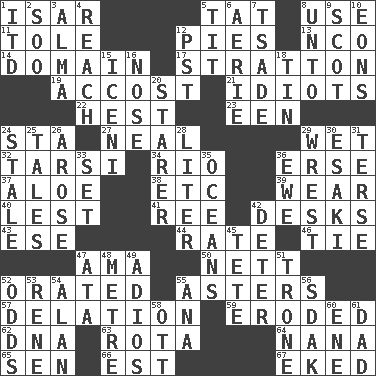 ACROSS 1. Austrian river, tributary to the Danube 5. Make lace 8. Purpose 11. Lacquered or enameled metalware 12. Sliced desserts 13. Non-commissioned officer (abbr.) 14. Kingdom 17. Ski resort town in Vermont 19. Buttonhole 21. Foolish or stupid persons 22. Command 23. Car or cant ending 24. R.R. building 27. Actress Patricia 29. Dripping 32. Tarsus (plural) 34. River (Sp.) 36. Celtic language 37. _ vera 38. And so on (abbr.) 39. Put on (as clothing) 40. For fear that 41. To separate or throw off 42. Writing tables 43. Compass dir. 44. Assign a rank or rating to 46. Neckwear 47. Nursemaid (var.) 50. Remaining after all deductions 52. Declaimed 55. Michaelmas daisies 57. Conveyance 59. Eaten away 62. Heredity factor (abbr.) 63. Roll call or roster of names 64. Grandmother 65. Elected rep. 66. Eastern Standard Time (abbr.) 67. Supplemented with great effort DOWN 1. It would 2. "Barney Miller" actor Jack 3. _ mater 4. Arrive at 5. Teat (slang) 6. Nest on high 7. Sadhe (variant) 8. To (old English) 9. Highlander 10. Immeasurably long periods of time 12. Pacific Standard Time (abbr.) 15. Ancient Celtic tribe of eastern Britain 16. Characteristic smell of wine 18. Metal container 20. A viewer who gazes fixedly 24. Having lost freshness 25. Lies 26. Came up 28. 61 cubic inches 29. Take or capture by force 30. 1973 Nobel Price Winner (Physics) Leo 31. Laconic 33. Arrange properly for use 35. Seas 36. She-sheep 42. Prevent from occurring 45. Wig 47. _ moment's notice (2 wds.) 48. Distance measurement (Brit.) 49. Goodbye (Sp.) 51. Marketplace scale 52. Probability 53. French philosopher Descartes 54. ____ Jay Lerner 55. Santa ___, CA 56. Neighbor of Neb. 58. Baseball player Mel 60. Compass dir. 61. June honoree