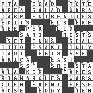 ACROSS 1. Parent Teacher Assoc. 4. Mild oath 8. Carryall 12. Length times width 14. Vegetable dish 16. Gumbo ingredient 17. Canvas cover 18. Pleas 20. Prepares for publication 22. Raised railways 23. Supplement with great effort 24. Born 25. For each 28. Flaplike covering 30. Indian skirt 31. Musical pauses 35. Put into a specified state 37. Lodging establishments 40. Lick closed 41. "Tell ____ the Marines!" 42. 1973 Nobel Price Winner (Physics) Leo 44. Inwardly 45. "Change" in Tahitian 46. The front part of a cuirass 47. Compass dir. 48. N. Chile seaport 50. 90 degrees 52. Fast jet (abbr.) 54. _ Lanka 55. R.R. building 58. Insect wing 61. Apertif with cassis 63. Corrects by punishment or discipline 65. Frustrating wastes of time 70. Armed conflicts 71. Clement's nick name 72. Incident 73. Celtic language 74. Stockings 75. Whirlpool 76. "___ Little Indians" DOWN 1. Eucharist need 2. Barter 3. Nest on high 4. Compass dir. 5. Separate the seeds from cotton 6. Keyboard modifier key 7. Have the gumption 8. Small child 9. Migrant worker of the '30s 10. Long journey 11. Relaxation 13. Fitting 15. Small valley 19. SW Saudi Arabia district 21. Health resort 26. 4th largest of the Great Lakes 27. Remove soap 29. Cease 30. Unemotional ones 32. Elected reps. 33. Falsehood 34. Stealthy 35. Play the lead 36. Needle case 38. Tired old horse 39. Atmospheres 41. Call ___ day 43. Austrian river, tributary to the Danube 49. "____ silly question..." 51. Be seated 53. Hoop that covers a wheel 55. Don Adams' spy role 56. Laconic 57. NE Netherlands city 58. Bowlike part 59. _ and Stitch 60. Eras 62. Be footloose 64. Deep reverence 66. Madame (abbr.) 67. Directed 68. Conclusion 69. Filthy place