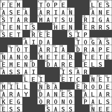 ACROSS 1. Opposite of masc. 4. Drink excessively 8. French article 11. At sea 13. Believer in; advocate of (suffix) 15. One (Scot) 16. Play the lead 17. Taiwanese island in East China Sea 18. Port city in Latvia 19. Portable shelters 21. Layer 22. Blunders 23. Put into a specified state 24. To separate or throw off 27. Small drink 29. Opera by Verdi 30. Ancient Roman robes 34. Small child 36. Operatic vocal solo 39. Window treatment 40. Billionth: prefix 41. Distance measurement 43. Wig 44. Make improvements or corrections to 46. Have the gumption 47. Raised railways 48. Slender Brazilian palm 49. Austrian river, tributary to the Danube 51. Luau accessory 53. And so on (abbr.) 54. Fish or hair follower 57. Place where flour is made 60. Basketball assoc. 63. Eat (away) 65. Like ___ of sunshine 66. Natives or inhabitants of Denmark 69. Having or resembling wings 70. Barrel 71. U. of Maine site 72. Friends 73. Curvy letter 74. Backtalk 75. Born DOWN 1. Goes without food and/or water 2. First name in cosmetics 3. Intended 4. Scottish cap 5. Mouth or opening 6. Heart or essence 7. Comfort 8. Den 9. Engineer (abbr.) 10. Oceans 12. Nonscientific branch of learning 14. Religious women 18. Newsperson 20. _ Lanka 25. Dutch treat 26. Having ears or earlike features 28. It would 29. Without tonality 31. Highlander 32. Flats, for short 33. Perceive with the eye 34. Scottish caps 35. Washington bills 37. Call ___ day 38. Nest on high 40. Teachers' org. 42. Remainder 45. Pass on 50. Adept person 52. _ china 54. Pitcher Ryan 55. Peak District village in England 56. Laconic 57. Cause to be 58. Angers 59. Straggles 61. Taverns 62. Small Philippine buffalo 64. Reproach for some lapse or misdeed 67. Followers of ems 68. Distress signal