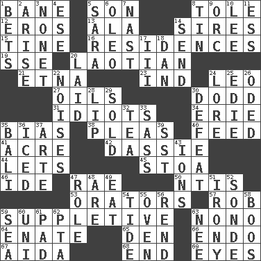 ACROSS 1. Object of repulsion 5. Manchild 8. Lacquered or enameled metalware 12. Greek god of love 13. In the manner of 14. Fathers 15. Prong on a fork 16. Homes 19. Compass dir. 20. Of or relating to Laos or its people 21. Inactive volcano in Sicily 23. Indiana (abbr.) 24. Lion 27. Lubricates 30. Texas town _ City 31. Foolish or stupid persons 34. One of the Great Lakes 35. Prejudice 38. Entreaties 40. Nourish 41. 43,560 square feet 42. Hyrax 44. Allows 45. Portico 46. Binary compound 47. Actress Charlotte 50. Nuclear Threat Initiatives 53. Speakers 57. Director Reiner 59. Supplying deficiencies 63. Words to Nanette 64. Maternal 65. Lair 66. Inside; within (prefix) 67. Opera by Verdi 68. Conclude 69. Sight organs DOWN 1. Wagers 2. Get up 3. Music written for nine 4. Compass dir. 5. "Two Mules for Sister ____" 6. Margarine 7. Political cartoonist Thomas 8. Metal container 9. The grampus (Milton) 10. Area sheltered from the wind 11. Double-curved letter 14. Post 17. One more than two 18. Daniel's nick name 20. Put down 22. Annoying sounds 24. Old wives' tales, e.g. 25. Singer Brickell 26. Wrote a lyric poem 28. Mouth edge 29. Disposed of to a purchaser 30. Outscore 32. Afternoon social gathering 33. Backtalk 35. Indonesian resort city 36. On the rocks 37. Johnson of "Laugh-In" 39. Fast jet (abbr.) 43. Charged particles 47. Hero or heavy, e.g. 48. "We ___ not amused" (Victoria) 49. Ingest 51. Literary sarcasm 52. Something which is sent 54. Event that recurs at intervals 55. Baking chamber 56. Tear apart 58. Scornful sounds 59. Ocean 60. University (slang) 61. Groovy apt. 62. Parent Teacher Assoc. 63. Born