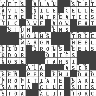 ACROSS 1. Soaks 5. Actor Alda or Thicke 9. Back-to-school mo. 13. Advice 14. Mediterranean tributary 15. Cell (Danish) 16. Prong on a fork 17. Pleas 19. Affectionate concern, for short 20. Deep reverence 21. Solemn pledge 22. Ingest 23. Make senseless or dizzy 25. Followers of ems 26. Parts of speech 30. Relationship diagram 34. Make _____ (do battle with) 35. Person who is morally reprehensible 36. "You Light Up My Life" star Conn 39. Removes the wrinkles 42. Snakelike fish 43. Aroma 44. Off-Broadway awards 46. Sense of smell 47. Tarsus (plural) 48. According to 51. SW Saudi Arabia district 54. Commissioned military rank (abbr.) 57. For each 58. Australian flightless bird 60. Male parent 62. Conciliate 65. Indian skirt 66. Before Barbara or Clara 67. A slight indication 68. "______ My Girl" (Turtles hit) 69. Portico 70. Set down 71. Torque (variant) DOWN 1. Electrical Unit 2. Vices 3. A color or tint 4. Compass dir. 5. Afresh 6. Actor's bit 7. Keyboard modifier key 8. Boldness 9. Arrange properly for use 10. Writer Wiesel 11. Entreaty 12. Trial 15. Crow sounds 18. A really long time 20. Small Philippine buffalo 24. Undo the wiring of 27. RI univ. 28. And not 29. Snout, nose 30. College paper 31. To separate or throw off 32. Snakelike fish 33. Raised railways 36. Spanish title 37. Wedding promise 38. Two (Sp.) 40. Basketball assoc. 41. Title for a knight 45. He sold his birthright 48. Capital of Western Samoa 49. Allow 50. N. Chile seaport 52. Potato state 53. More uncommon 54. Global Positioning Systems (abbr.) 55. Part of Q.E.F. 56. Words to Nanette 58. Needle case 59. Rendezvous 61. Flat circle 63. Parent Teacher Association (abbr.) 64. Everything 65. Fast jet (abbr.)