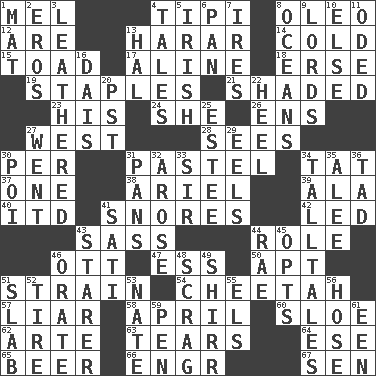 ACROSS 1. Cartoonist voice _ Blanc 4. Native american tent (variation) 8. Margarine 12. "We ___ not amused" (Victoria) 13. Ethiopian city, capital of Harari 14. Having a low temperature 15. Frog relative 17. Place in a line 18. Celtic language 19. Paper fasteners 21. Cast a shadow over 23. Part of HMS, perhaps 24. A female animal or person 26. Followers of ems 27. 270 degrees 28. Observes 30. For each 31. Soft color 34. Make lace 37. Single 38. Satellite of Uranus 39. Insect wing 40. It would 41. Sounds asleep 42. Directed 43. Backtalk 44. Hero or heavy, e.g. 46. Baseball player Mel 47. Double-curved letter 50. Fitting 51. Put through a sieve 54. Leopard's kin 57. One who doesn't tell the truth 58. Showery time 60. _ gin 62. Johnson of "Laugh-In" 63. Pulls into pieces 64. Compass dir. 65. Fermented drink made from hops 66. Engineer (abbr.) 67. Elected rep. DOWN 1. Floor covering 2. Greek god of love 3. Resembling or made to resemble leather 4. Stories 5. From or relating to Ireland 6. Baking dish 7. Angers 8. Seas 9. Domineers 10. Otherwise 11. Wrote a lyric poem 13. Actor Linden 16. Raised platform 20. Pacific Standard Time (abbr.) 22. The bottom of a shoe or boot 25. First name in cosmetics 27. Left 29. Snakelike fish 30. Luau course 31. Zero-star reviews 32. Came up 33. Title for a knight 34. Baron Munchausen's specialties 35. Toward shelter 36. Small boy 41. Suttee (variant) 43. A viewer who gazes fixedly 44. Actress Charlotte 45. Chooses 46. Declaim 48. Strangle with an iron collar 49. Bake eggs in their shells 51. Thick slice 52. Hoop that covers a wheel 53. Nathan's nickname 55. Raised railways 56. Flexible conduit 59. Writing instrument 61. Car or cant ending