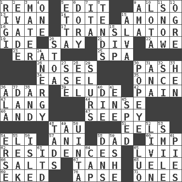 ACROSS 1. San ____ (Riviera town) 5. Prepare for publication 9. In addition 13. "Terrible" tsar 14. Carry 15. Amid 16. Yard entry 17. Interpreter 19. Binary compound 20. Declare 21. HTML Container Element 22. Deep reverence 23. Part of Q.E.F. 25. Health resort 26. Olfactory organs 30. Romantic infatuation 34. Artist's stand 35. Single time 36. The sixth month of the Jewish calendar 39. Dodge 42. Ache 43. Long (Scottish) 44. Wash lightly 46. "60 Minutes" Commentator Rooney 47. Oozy 48. The 19th letter of the Greek alphabet 51. Snakelike fish 54. Connecticut Ivy Leaguer 57. Black tropical American cuckoo 58. June honoree 60. Mischievous child 62. Dwellings 65. 57 in ancient Rome 66. Table seasonings 67. Hyperbolic tangent 68. Ubangi River tributary 69. Supplemented with great effort 70. Domed church section 71. Washington bills DOWN 1. Swiss mountan, "Queen of the Mountains" 2. Elude 3. Mother 4. Single 5. Singer James 6. Dinghy 7. Call ___ day 8. Looks after 9. Nanny (var.) 10. Globular water bottle used in Asia 11. Frozen precipitation 12. Legendary monster 15. Inventor's middle name 18. Small drink 20. Portico 24. Disorder of the immune system 27. Compass dir. 28. Snakelike fish 29. Plays smoothly or legato 30. Wimpy's pal 31. Santa ___, CA 32. _-fi 33. Layer 36. According to 37. Daniel's nick name 38. Also 40. Pass on 41. Compass dir. 45. Hurried 48. Small amounts or degrees 49. A saturated hydrocarbon 50. National forest in Provo, Utah 52. Make or become more lively 53. Grin 54. Celtic language 55. Path through which fluid escapes 56. Capri or Wright 58. Cub Scout units 59. American tennis player Robert 61. Sliced desserts 63. It would 64. Head covering 65. Nilotic language