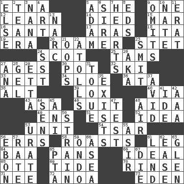 ACROSS 1. Inactive volcano in Sicily 5. American tennis player Robert 9. Single 12. Acquire or gain knowledge or skills 14. Passed on 15. Make imperfect 16. Before Barbara or Clara 17. Ancient river in northeast Turkey 18. Call ___ day 19. Period 20. Wanderer 23. Proofreading order 24. Native of Scotland 25. Scottish caps 27. Matures 30. Plant holder 32. What Jean-Claude Killy likes to do 33. Remaining after all deductions 34. _ gin 36. "One Day ___ Time" 38. The first octave above the treble staff 39. Brine-cured salmon 40. By way of 43. White ___ sheet 46. Costume for a special activity 48. Opera by Verdi 49. Followers of ems 51. Compass dir. 52. The main thing one is thinking about 53. A single undivided whole 54. Russian ruler of old 56. Blunders 58. Cooks with dry heat, as in an oven 61. Part of a journey 64. Sound made by sheep 65. Baking dishes 66. Standard of perfection 68. Baseball player Mel 69. Event that recurs at intervals 70. Wash lightly 71. Born 72. Small Philippine buffalo 73. Genesis locale DOWN 1. Otherwise 2. Lacerate 3. Nanny 4. Tate display 5. First of billions? 6. Beget 7. Centers of feelings and intuitions 8. Begley and Asner 9. Leaves out 10. Nathan's nickname 11. Part of Q.E.F. 13. Drug cop 21. I made a mistake 22. Ringlike coral islands and reefs 23. Stricken, poetically 24. Fast jet (abbr.) 26. Alias (abbr.) 27. Santa ___, CA 28. Set 29. Singer James 31. Woman's close-fitting hat 35. Is 37. Enthusiastic 41. Binary compound 42. American Automobile Association (abbr.) 44. Elected reps. 45. Cuckoo 47. Trial 48. Wind 50. Put through a sieve 53. A salt of uric acid 55. SW Saudi Arabia district 56. Inky black, to poets 57. Assign a rank or rating to 59. Southwest Nigerian state 60. At sea 61. Grant temporary use of 62. Relaxation 63. Small, secluded valley 65. Parent Teacher Assoc. 67. Pass on