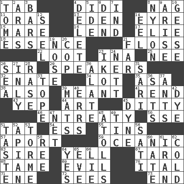 ACROSS 1. Keyboard key 4. "You Light Up My Life" star Conn 8. Tired old horse 11. Mouths or openings 13. Locale of original sin 14. Jane of fiction 15. Female horse 16. Grant temporary use of 17. Writer Wiesel 18. Core 21. Soft thread for cleaning between teeth 22. Spoils 23. _ tizzy (2 wds.) 25. Born 26. Title for a knight 29. Orators 32. Maternal 34. Car dealer's back yard 35. White ___ sheet 38. In addition 39. Intended 41. Tear apart 43. Slangy assent 44. Tate display 45. Simple song 46. Plea 50. Compass dir. 51. Make lace 54. Curvy letter 55. Airtight sealed metal containers 57. To the left, to Queeg 59. Pertaining to the sea 63. Father 64. Shout 67. Pacific island yam 68. Not wild 69. Tending to cause great harm 70. Slanted text style (abbr.) 71. Compass dir. 72. Perceives with the eye 73. Conclusion DOWN 1. Heavy book 2. Ancient river in northeast Turkey 3. Oblong pieces of solid material 4. Keyboard key 5. Binary compound 6. Lair 7. Indiana (abbr.) 8. Thermoplastic polyamide 9. Get up 10. Honkers 12. Sew up the eyelids of hawks and falcons 14. Snakelike fish 19. Characteristic smell of wine 20. Police officer (slang) 21. At a great distance 23. Visual representation of an object 24. Remaining after all deductions 26. Ocean 27. Inwardly 28. Raze (variant) 30. Having winglike extensions 31. Indian skirt 33. Drink excessively 36. Puts into a specified state 37. Pismires 39. Floor coverings 40. Blunders 42. Color 45. Centimeter-gram-second unit of force 47. Fish or hair follower 48. Ringlike coral islands and reefs 49. Nervous spasm 51. Clothes sense 52. Bee-related 53. Singer Mel 56. Suttee (variant) 58. Portuguese money of account (variant) 60. Nathan's nickname 61. SW Asia republic 62. Having a low temperature 64. It is so 65. Night before a holiday 66. Untruth