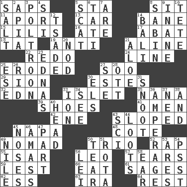 ACROSS 1. Plant excrements 5. R.R. building 8. Be seated 11. To the left, to Queeg 13. 4-wheeled motor vehicle 14. Object of repulsion 15. Ms. Damita and namesakes 16. Had dinner 17. Blind as ____ 18. Make lace 19. Against 21. Place in a line 22. Do over again 24. Actor's bit 25. Eaten away 27. "Barney Miller" actor Jack 29. The Jewish people; Israel 30. _____ Park, CO 32. Pulitzer Prize-winning author Ferber 33. Small island 35. Nanny 39. Imelda's hoard 41. Sign of things to come 42. Compass dir. 43. Inclined 45. California wine valley 48. ____ d'Azur (French Riviera) 49. Roamer 50. Musical group of three 52. Reproach for some lapse or misdeed 55. Austrian river, tributary to the Danube 56. Lion 57. Pulls apart 59. For fear that 60. Consume 61. Gurus 62. Double-curved letter 63. Retirement account (abbr.) 64. State of inaction DOWN 1. Table seasoning 2. Capital of Western Samoa 3. Characterized by complete cowardliness 4. _ Lanka 5. Scram, to a cat 6. Jacques of French films 7. "We ___ not amused" (Victoria) 8. Unit of acoustic absorption 9. Lacking in sense or substance 10. Wig 12. Sadhe (variant) 14. Indonesian resort city 20. Allow head to fall sleepily 21. _ vera 23. Ferber et al. 25. Compass dir. 26. To free from 27. Compass dir. 28. Baseball player Mel 30. Raised railways 31. Snout, nose 33. Electrically charged atom 34. Observe 36. Electrical Measurement 37. Born 38. Plus 40. Froth on beer 43. _-fi 44. Plunders 45. Olfactory organs 46. Collect or gather 47. Role in a play 49. Mediterranean tributary 50. Pull into pieces 51. Round or rotation of duties 53. Ancient Greek god of war 54. Inconspicuous attention getter 56. Flowery wreath 58. Ewer handle