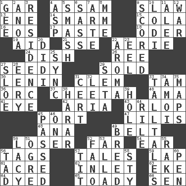 ACROSS 1. Slender fish 4. Indian state 9. Cole _ (cabbage dish) 13. Compass dir. 14. Excessive but superficial compliments 15. Root beer relative 16. Greek goddess of the dawn 17. Thick mixture 18. River in Europe 19. Help 21. Compass dir. 22. Nest on high 24. Food container 26. Portuguese money of account (variant) 27. Morally degraded 29. Disposed of to a purchaser 30. Soviet premier 1918-24 31. To starve (Brit.) 33. Scottish cap 36. The grampus (Milton) 37. Leopard's kin 40. Housemaid (var.) 41. Sight organ 42. Operatic vocal solo 43. Fourth or lowest deck 45. Sweet dark-red dessert wine 47. Ms. Damita and namesakes 48. Santa ___, CA 49. Waist strap 50. Failure 52. Distant 54. Ewer handle 56. Labels 57. Falsehoods 59. Pet locale 61. 43,560 square feet 62. An arm off of a larger body of water 63. Supplement with great effort 64. Colored 65. Sycophant 66. Elected rep. DOWN 1. Unit of force equal to gravity 2. Small Philippine buffalo 3. Home 4. Cleo's killer 5. Box-office sellout 6. Backtalk 7. Johnson of "Laugh-In" 8. Madame (abbr.) 9. Tallied 10. Farming town in central California 11. Toward shelter 12. Armed conflict 20. "You Light Up My Life" star Conn 22. Scent 23. Snakelike fish 25. Synchronize (abbr.) 27. A type of plum 28. Suggestive of the supernatural 29. Stalk of a moss capsule 31. Foregone conclusion 32. Luau accessory 33. Baron Munchausen's specialties 34. Mine, in Marseilles 35. Atlas contents 38. Ethiopian city, capital of Harari 39. Opening into or through something 44. Cause heat under the collar 45. Went by 46. Single 49. A special lineage 50. Made of lace 51. Legendary monster 52. Papal veil 53. Silent film actress Nazimova 55. Immoral or dissolute person 56. Small boy 57. Teat (slang) 58. Filthy place 60. Fenced enclosure