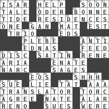 ACROSS 1. Austrian river, tributary to the Danube 5. Aid 9. Within a short period 13. Falsehood 14. Baltic tributary 15. Maid-servant 16. Event that recurs at intervals 17. Dwellings 19. Single 20. Separate the seeds from cotton 21. Floor protector 22. Eastern Standard Time (abbr.) 23. Musical group of three 25. Begley and Asner 26. Cadet 30. Opposed to 34. Ferber et al. 35. Nourish 36. Flat circle 39. Smooth fabric 42. French philosopher Descartes 43. Roberta Peters solo 44. Maternal 46. Drug cop 47. Gurus 48. Greek goddess of the dawn 51. Quiet! 54. Institute legal proceedings 57. Whopper 58. Make lace 60. American Automobile Association (abbr.) 62. Interpreter 65. Torque (variant) 66. Match 67. Nathan's nickname 68. Having or resembling wings 69. Western Nevada city 70. Takes to court 71. We are DOWN 1. "Tell ____ the Marines!" 2. Inhabitant of Heaven 3. Tree or shrub in the Birch family 4. To sift 5. Israeli folk dance 6. Locale of original sin 7. French article 8. A-one 9. Boy, to dad 10. At one time in the past 11. Washington bills 12. A home for chicks 15. Stakes 18. June honoree 20. Gilt 24. Medicinal drug used to evoke vomiting 27. Followers of ems 28. Sound made by sheep 29. _____ Park, CO 30. Anew 31. Born 32. "___ Little Indians" 33. Binary compound 36. Daniel's nick name 37. Lyricist Gershwin 38. Title for a knight 40. _ tizzy (2 wds.) 41. Tired old horse 45. Trial 48. Otherwise 49. Lubricate 50. Seines 52. White Person, in Hawaii 53. Ethiopian city, capital of Harari 54. Play the lead 55. Goad 56. Merit 58. Haul 59. Ancient Greek god of war 61. 1/640 square mile 63. Modern: prefix 64. The 19th letter of the Greek alphabet 65. The 23rd letter of the Hebrew alphabet