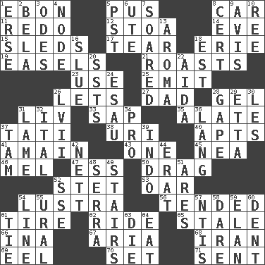 ACROSS 1. Inky black, to poets 5. Purulenc 8. Automobile 11. Make new 12. Portico 14. First lady 15. Bobsleighs 17. Pull into pieces 18. One of the Great Lakes 19. Artist's stands 21. Exposes to great heat 23. Purpose 25. Send forth 26. Allows 27. June honoree 28. Set 31. 54 in ancient Rome 33. Plant excrement 35. Having winglike extensions 37. Jacques of French films 38. RI univ. 40. Flats, for short 41. With great haste 43. Single 45. Teachers' org. 46. Cartoonist voice _ Blanc 47. Curvy letter 50. To draw with force 52. Proofreading order 53. Boat paddle 54. A period of five years 56. Looked after 61. Hoop that covers a wheel 62. Travel on or in a vehicle 65. Having lost freshness 66. _ tizzy (2 wds.) 67. Operatic vocal solo 68. SW Asia republic 69. Snakelike fish 70. Put into a specified state 71. Emitted DOWN 1. Celtic language 2. Actor Lugosi 3. Lyric poems 4. Thickened enlargement 5. Pacific Standard Time (abbr.) 6. Shoshoni 7. Flew 8. An absolute certainty 9. Deliberation 10. To sift 13. Odor 16. Turn sharply 18. Eastern Standard Time (abbr.) 20. Fast planes 22. Opera by Verdi 24. He sold his birthright 26. 57 in ancient Rome 28. Yawn 29. Singer James 30. French article 31. Unable to walk 32. Slanted text style (abbr.) 34. Adept person 36. Long (Scottish) 37. Scottish cap 39. _ china 42. Remaining after all deductions 44. Part of Q.E.F. 48. Father Junipero _ 49. Flight of steps 51. Ancient Greek god of war 52. Compass dir. 54. Actor's bit 55. Mountain range 57. Nuclear Threat Initiatives 58. Have the gumption 59. Liveliness 60. Incision 61. Make a knot 63. Pass on 64. Erode