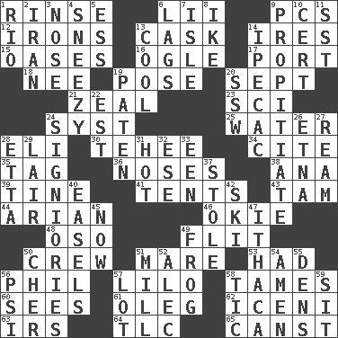 ACROSS 1. Wash lightly 6. Cards in a Roman deck? 9. Personal Computers (abbr.) 12. Removes the wrinkles 13. Keg 14. Angers 15. Fertile tracts in a desert 16. Stare 17. Left side of a ship or aircraft 18. Born 19. Introduce or present, as a question 20. Back-to-school mo. 21. Ardor 23. _-fi 24. System (abbr.) 25. Wetness 28. Connecticut Ivy Leaguer 30. Giggle 34. Quote 35. Label 36. Olfactory organs 38. Santa ___, CA 39. Prong on a fork 41. Portable shelters 43. Scottish cap 44. Believer in; advocate of (suffix) 46. Migrant worker of the '30s 48. Bear (Spanish) 49. Secret move to avoid paying debts 50. Ship's personnel 51. Female horse 53. Possessed 56. Silvers or Donahue 57. _ and Stitch 58. Corrects by punishment or discipline 60. Observes 61. Cassini of fashion 62. Ancient Celtic tribe of eastern Britain 63. Big collection agency 64. Affectionate concern, for short 65. 2nd pers. sing. pres. of can (arch.) DOWN 1. River (Sp.) 2. SW Asia republic 3. Olfactory organ 4. Dwarf with a sinus problem 5. Curvy letter 6. Straggles 7. Small island 8. Mamie's husband 9. Conciliate 10. Sure thing 11. Fast jet (abbr.) 13. Calm and collected 14. Medicinal drug used to evoke vomiting 19. Eucharist need 20. Compass dir. 22. Eastern Standard Time (abbr.) 24. Seigniories (variant) 26. Inactive volcano in Sicily 27. 480, 500 or 516 sheets of paper 28. Singer James 29. Den 31. Being at a high temperature 32. Compass dir. 33. Car or cant ending 37. Fur scarf 40. Artist's stands 42. What Jean-Claude Killy likes to do 45. Immediately 47. New York city 49. Tree-dwelling hopper 50. "Mermaids" star 51. Place where flour is made 52. Actor Baldwin 54. So be it 55. Cub Scout units 56. 23rd letter of the Greek alphabet 57. Car dealer's back yard 58. Nervous spasm 59. Be seated