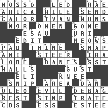 ACROSS 1. With motion or animation 6. Directed 9. Actress Charlotte 12. N. Chile seaport 13. Cause heat under the collar 14. Transmit 15. Bodily heat indicating an inflammation 16. "Terrible" tsar 17. Religious women 18. Or not 19. Presage 20. Went 21. He sold his birthright 23. RI univ. 24. Prepare for publication 25. Catcalls? 28. Groovy apt. 30. One or ones belonging to thee 34. Fastener 35. Black tropical American cuckoo 36. Bull 38. Retirement account (abbr.) 39. Ear part 41. Natives or inhabitants of Denmark 43. Fast jet (abbr.) 44. Promenades 46. Abrupt rush of wind 48. Biblical high priest 49. Leg joint 50. Clip 51. Length times width 53. Daniel's nick name 56. Margarine 57. Morally bad or wrong 58. Debunk (Brit. slang) 60. Repose 61. Simple or foolish person 62. Feeling or showing extreme anger 63. Music discs 64. Double-curved letter 65. First name in cosmetics DOWN 1. Big _ 2. Northwest Algerian city 3. Grain storage tower 4. Tallied 5. Boat paddle 6. Moving, as bait 7. Style 8. Lair 9. One who advocates reunion 10. Singer Murray 11. Begley and Asner 13. Tall New Zealand timber tree 14. Sounds asleep 19. Curses 20. Chewing product 22. Be seated 24. The property of being fit to eat 26. Armed conflicts 27. Argument over a trivial matter 28. Inside of hand 29. Small Philippine buffalo 31. It would 32. Teachers' org. 33. Car or cant ending 37. Rain (Swedish) 40. American author Paul (1891-1958) 42. Take to court 45. Small drink 47. Spring feasts 49. Seaweed 50. Downhill vehicle 51. Deliberation 52. Basketball hoops 54. Blind as ____ 55. Nathan's nickname 56. The grampus (Milton) 57. Compass dir. 58. Pass on 59. Turn to the right
