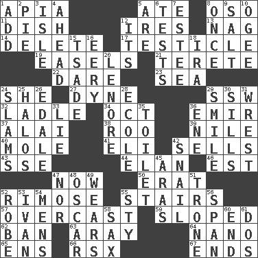 ACROSS 1. Capital of Western Samoa 5. Had dinner 8. Bear (Spanish) 11. Food container 12. Angers 13. Tired old horse 14. Keyboard key 17. One of the two male reproductive glands 19. Artist's stands 21. Cylindrical with tapered ends 22. Have the gumption 23. Ocean 24. A female animal or person 27. Unit of force 29. Compass dir. 32. Dipping utensil 34. Sep. follower 36. Independent ruler or chieftain 37. Jai _ 38. Friend of Pooh 39. Mediterranean tributary 40. Undercover agent 41. Connecticut Ivy Leaguer 42. Exchanges for money 43. Compass dir. 44. Style 46. Eastern Standard Time (abbr.) 47. Immediately 50. Part of Q.E.F. 52. Full of chinks, cracks, or crevices 55. Flight of steps 57. Cloudy 59. Slanted 62. Bar 63. Like ___ of sunshine 64. Billionth: prefix 65. Followers of ems 66. Acura sports coupe 67. Extremities DOWN 1. Find the sum of 2. Sliced dessert 3. Small island 4. Toward the future 5. "We ___ not amused" (Victoria) 6. Trials 7. First name in cosmetics 8. Single time 9. Table seasoning 10. Double curve, resembling the letter S 12. It is 15. Sadhe (variant) 16. Suggestive of the supernatural 18. Lyricist Gershwin 20. Poe poem 24. Shuts with force 25. Auras 26. Peak District village in England 28. Learning spot: Fr. 29. Grin 30. Beverly of Met fame 31. Obtain by seizing forcibly or violently 33. Falsehood 35. Bathroom plumbing fixture 36. Compass dir. 42. Slow-paced one 45. Ancient river in northeast Turkey 47. Or not 48. Witty Wilde 49. Erodes 51. Heavy duty weighing machine 52. Loose flowing garment 53. "Terrible" tsar 54. Not women's 55. Filthy place 56. Connect, as a bridge 58. Saxophone 60. Conclude 61. Two (Sp.)