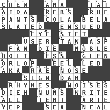 ACROSS 1. Group working together 5. Santa ___, CA 8. Make lace 11. Opera by Verdi 12. Confederate soldiers (slang) 14. Sorrow 15. Leg coverings 17. Root beer relative 18. Actor Lugosi 19. Scheduled 21. Took place subsequently 23. Sight organ 25. Proofreading order 26. One who uses or employs something 27. The 23rd letter of the Hebrew alphabet 28. Viper 31. Air blower 33. Expire 35. Having high moral qualities 37. Stupid person 38. Curvy letter 40. Small, secluded valley 41. Lowest deck of a ship 43. Snakelike fish 45. Directed 46. Alias (abbr.) 47. Actress Charlotte 50. Sense of smell 52. Omen 53. One of the 12 tribes of Israel 54. Poems 56. Annoying sounds 61. South Vietnam president (1954) 62. Religious women 65. Compose 66. 100% 67. Portable shelter 68. Johnson of "Laugh-In" 69. Slangy assent 70. Ocean 71. Actress Patricia DOWN 1. Balmoral and tarboosh 2. Monetary unit of Yemen 3. Pulitzer Prize-winning author Ferber 4. Electrical Unit 5. Curve 6. Modern: prefix 7. Most capable 8. Woody plant 9. Old (Scot.) 10. Beverage made from leaves 13. Before Barbara or Clara 16. Observes 18. On the contrary 20. Colored 22. Stitched 24. 4th largest of the Great Lakes 26. To (old English) 28. Competent 29. Downhill vehicle 30. Animal enclosure 31. Tined utensil 32. Silent film actress Nazimova 34. Compass dir. 36. Stare at amorously 37. ___ good deed 39. Post 42. Demure 44. Grant temporary use of 48. Rep 49. Takes place subsequently 51. Frozen precipitation 52. Symbol (abbr.) 54. Cause heat under the collar 55. Aid 57. SW Asia republic 58. The founder of a family 59. Singer James 60. Sew up the eyelids of hawks and falcons 61. 24 hours 63. Compass dir. 64. R.R. building