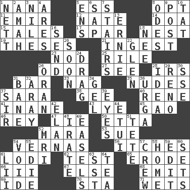 ACROSS 1. Grandmother 5. Curvy letter 8. Choose 11. Arab leader 12. Nathan's nickname 14. ___ good deed 15. Lies 17. Practice fight 18. Egg locale 19. College papers 21. Eat 23. Lower and raise head in agreement 25. Cause heat under the collar 26. Scent 27. Observe 28. Big collection agency 31. Oblong piece of solid material 33. Tired old horse 35. Unclothed pictures 37. "Two Mules for Sister ____" 38. Turn to the right 40. French philosopher Descartes 41. Lacking in sense or substance 43. Sodium hydroxide 45. E Mali city 46. Marina Del _, California 47. Whopper 50. Singer James 52. Hindu Mythology: god of death 53. Take to court 54. Actresses Bloom and Felton 56. Irritating cutaneous sensations 61. Farming town in central California 62. Trial 65. Wear away 66. One more than two 67. Otherwise 68. Send forth 69. Binary compound 70. R.R. building 71. Moistens DOWN 1. Remaining after all deductions 2. Nursemaid 3. Mediterranean tributary 4. Ancient Greek god of war 5. Followers of ems 6. Plant excrement 7. Flight of steps 8. Lyric poems 9. Mail 10. Make lace 13. Bert's buddy 16. Post 18. Born 20. Within a short period 22. Small, secluded valley 24. To draw with force 26. Northwest Algerian city 28. The main thing one is thinking about 29. Former U.S. Attorney General Janet 30. Compass dir. 31. Object of repulsion 32. Like ___ of sunshine 34. Set 36. Capital and largest city of Mongolia 37. Title for a knight 39. Snake ____ (dice throw) 42. Style 44. Needle holder 48. Feeling or showing extreme anger 49. Artist's stands 51. Wig 52. Medical imaging device (abbr.) 54. Empty area or space 55. Singer Brickell 57. Group working together 58. Dwelling 59. Prepare for publication 60. Arranges properly for use 61. Cards in a Roman deck? 63. Fast jet (abbr.) 64. Beverage made from leaves