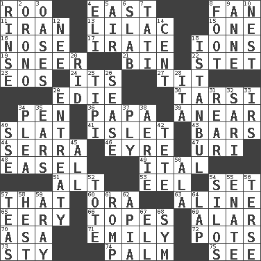 ACROSS 1. Friend of Pooh 4. 90 degrees 8. Air blower 11. SW Asia republic 13. Pale purple color 15. Single 16. Sense of smell 17. Feeling or showing extreme anger 18. Charged particles 19. Scornful expression 21. Storage container 22. Proofreading order 23. Greek goddess of the dawn 24. It is 27. Teat (slang) 29. Singer Brickell 30. Tarsus (plural) 34. Fenced enclosure 36. Dad 39. Approach 40. Narrow board 41. Small island 43. Oblong pieces of solid material 44. Spanish missionary in California 46. Jane of fiction 47. RI univ. 48. Artist's stand 49. Slanted text style (abbr.) 51. Keyboard modifier key 53. Snakelike fish 54. Put into a specified state 57. Not this but _ 60. Mouth or opening 63. Place in a line 65. Suggestive of the supernatural 66. Drinks excessively 69. Having or resembling wings 70. White ___ sheet 71. Poet Dickinson 72. Plant holders 73. Filthy place 74. Inside of hand 75. Perceive with the eye DOWN 1. Wash lightly 2. U. of Maine site 3. Fertile tracts in a desert 4. Biblical high priest 5. Wind 6. Broad, flat, thick piece 7. Jacques of French films 8. Pick up the tab 9. Singer Murray 10. A home for chicks 12. Born 14. Penny 18. Byzantium, centuries later 20. To free from 25. Native american tent (variation) 26. Gospel singer Marvin 28. Call ___ day 29. Plea 31. Stern 32. Indian skirt 33. Big collection agency 34. Entreaty 35. Hearing organs 37. Apply oneself diligently 38. Nest on high 40. Compass dir. 42. Wig 45. 100% 50. Insect wing 52. Lug 54. Grain storage towers 55. Maternal 56. Laconic 57. Beverages made from leaves 58. Behest 59. Like ___ of sunshine 61. Play 62. Capital of Western Samoa 64. Pet locale 67. Pipe bend 68. Symbol (abbr.)