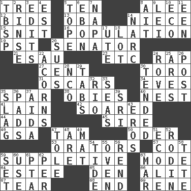 ACROSS 1. Family _ (genealogy) 5. "___ Little Indians" 8. Toward shelter 12. Auction offers 13. Chief or king in Benin or Nigeria 14. Sibling's daughter 15. In a ____ (agitated or irritated) 16. Census information 19. Pacific Standard Time (abbr.) 20. Elected representative 21. Son of Isaac 23. And so on (abbr.) 24. Strike 27. Penny 30. "Corrida" creature 31. Motion picture awards 34. Nights before holidays 35. Practice fight 38. Off-Broadway awards 40. A home for chicks 41. (Had) reclined 42. Flew 44. Does sums 45. The founder of a family 46. Girls' org. (abbr.) 47. Scottish cap 50. River in Europe 53. Speakers 57. Small bed 59. Supplementary 63. Method 64. First name in cosmetics 65. Lair 66. Came down and settled, as after flight 67. Rend 68. Conclude 69. French philosopher Descartes DOWN 1. Cook's measure (abbr.) 2. Remove soap 3. Proofreads 4. Eastern Standard Time (abbr.) 5. Drink excessively 6. Inky black, to poets 7. California wine valley 8. Small island 9. Flowery wreath 10. Environmental prefix 11. Car or cant ending 14. Drug cop 17. Shoshoni 18. Car dealer's back yard 20. Takes to court 22. Oak nuts 24. Be footloose 25. Ancient Greek god of war 26. Mail 28. Non-commissioned officer (abbr.) 29. Bar bills 30. Watched over 32. River (Sp.) 33. Oceans 35. Volcanic refuse 36. Groovy apts. 37. Opera by Verdi 39. _ Lanka 43. Greek god of love 47. Lacquered or enameled metalware 48. "We ___ not amused" (Victoria) 49. Floor covering 51. Learning spot: Fr. 52. "The Thinker" sculptor 54. Periodic rise and fall of the sea level 55. Baking chamber 56. Tear apart 58. False hair 59. Put into a specified state 60. Purpose 61. Parent Teacher Association (abbr.) 62. For each 63. Spoil