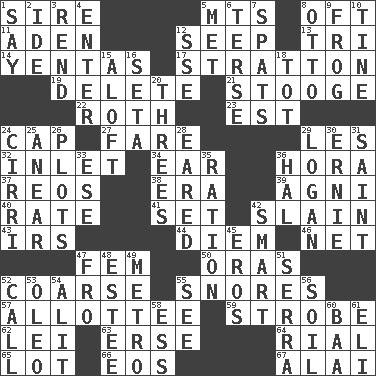 ACROSS 1. Male parent of an animal 5. Mountains (abbr.) 8. Often (poetically) 11. Arabian gulf 12. Ooze 13. Three (prefix) 14. Gossips 17. Ski resort town in Vermont 19. Keyboard key 21. Moe Howard, for one 22. Writer of Portnoy's Complaint (1969) 23. Eastern Standard Time (abbr.) 24. Head covering 27. Conductor's collection 29. French article 32. An arm off of a larger body of water 34. Ewer handle 36. Israeli folk dance 37. Vintage cars 38. Epoch 39. Hindu god of fire 40. Assign a rank or rating to 41. Arrange properly for use 42. Killed 43. Big collection agency 44. South Vietnam president (1954) 46. Fish or hair follower 47. Opposite of masc. 50. Mouths or openings 52. Unrefined 55. Sounds asleep 57. One to whom something is allotted 59. Disco prop 62. Luau accessory 63. Celtic language 64. Monetary unit of Yemen 65. Car dealer's back yard 66. Greek goddess of the dawn 67. Mountain range southwest of Kyrgyzstan DOWN 1. Declare 2. Binary compound 3. Tear apart 4. Keyboard key 5. Was introduced to 6. Laconic 7. Arguments over trivial matters 8. Von Bismarck 9. Toadlike animal 10. Prong on a fork 12. Compass dir. 15. High up in or into the air 16. Stalk of a moss capsule 18. Small child 20. Triads 24. High-altitude cloud 25. Approach 26. Small pieces of grounds 28. Having ears or earlike features 29. Utah city north of Ogden 30. Bert's buddy 31. Virtuous person 33. Compass dir. 35. Food allowance for one day 36. Actor Linden 42. Don Adams' spy role 45. Greek god of love 47. From 48. First name in cosmetics 49. Paris' subway 51. Spanish missionary in California 52. Give a ring to 53. Butter sub 54. Set down 55. Observe 56. Land 58. Double-curved letter 60. Sound made by sheep 61. Connecticut Ivy Leaguer