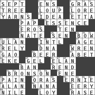 ACROSS 1. Back-to-school mo. 5. Followers of ems 8. Pate de foie ____ 12. Family _ (genealogy) 13. Central Nebraska county 15. Old wives' tales, e.g. 16. Entertaining tales 18. It may be bright or harebrained 19. Singer James 20. Infant food 22. Gist 24. Greek god of love 26. "___ Little Indians" 27. Nathan's nickname 28. Elected rep. 29. Ribbon knot 32. ____ Bator, Mongolia 35. International (abbr.) 37. Personal question 38. Have trust in 39. Heredity factor (abbr.) 40. Songbird 41. E Mali city 42. Fermented drink made from hops 43. Collude with 44. Make supply last 45. Set 46. Style 49. Bar 50. Tear apart 51. "Death Wish" actor 55. Compass dir. 56. Ache 57. Mouths or openings 59. Bert's buddy 63. Actor Alda or Thicke 64. Nanny 65. Suggestive of the supernatural 66. "Death on the ____" 67. Myrna of the movies 68. Raze (variant) DOWN 1. Filthy place 2. Epoch 3. For each 4. 3-inch nail 5. Connecticut Ivy Leaguer 6. Thickened enlargement 7. Takes to court 8. American astronaut and politician John 9. College mil. group 10. Johnson of "Laugh-In" 11. Ocean 14. Soft color 17. "Two Mules for Sister ____" 21. Cooking vessel 23. Car or cant ending 25. A glass for beer 28. A viewer who gazes fixedly 29. Sharp remark 30. Double curve, resembling the letter S 31. Left 32. Goad 33. Path through which fluid escapes 34. Medicinal plant 36. Compass dir. 40. Roamer 42. Gillaume's butler role 45. Separate the seeds from cotton 47. Area sheltered from the wind 48. Singer Murray 49. Child's nurse 51. Indonesian resort city 52. Monetary unit of Yemen 53. Relating to the mouth 54. Billionth: prefix 56. Baking dish 58. Declare 60. Teachers' org. 61. Big collection agency 62. Sight organ