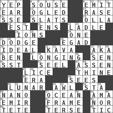 ACROSS 1. Slangy assent 4. Lush 9. Give off 13. Hearing organ 14. Stared at amorously 15. Raze (variant) 16. Compass dir. 17. Narrow boards 18. Spanish pot 19. Eastern Standard Time (abbr.) 21. Followers of ems 22. Dipping utensil 24. Charged atoms 26. Single 27. Evade 29. Mild oath 30. Perfect 31. Polynesian shrub of the pepper family 33. Alias (abbr.) 36. Benjamin's nick name 37. Yearning 40. Elected rep. 41. Fast jet (abbr.) 42. Sew up the eyelids of hawks and falcons 43. NE Netherlands city 45. Louse (plural) 47. One or ones belonging to thee 48. Period 49. Perceives with the eye 50. Type of eclipse 52. Leather borer 54. R.R. building 56. Billionth: prefix 57. Sea 59. Nanny (var.) 61. Independent ruler or chieftain 62. Movie unit 63. Or not 64. False hair 65. Laconic 66. Nervous spasm DOWN 1. It is so 2. Relaxation 3. Elected leader of a country 4. Distress signal 5. Stares 6. ____ Bator, Mongolia 7. Puts into a specified state 8. Begley and Asner 9. Worn away 10. Shopping center 11. Capri or Wright 12. Beverage made from leaves 20. Ancient Roman robe 22. Utah city north of Ogden 23. Santa ___, CA 25. 1994 drama film starring Jodie Foster 27. Claim 28. Lyric poems 29. Morally bad or wrong 31. Leg joint 32. Personal question 33. Aide 34. Peachy ____! 35. Singer Murray 38. Witty Wilde 39. Yard entry 44. "______ My Girl" (Turtles hit) 45. Poe poem 46. Retirement account (abbr.) 49. Shuts with force 50. Unable to walk 51. A single undivided whole 52. 43,560 square feet 53. Put on (as clothing) 55. Mine, in Marseilles 56. Fish or hair follower 57. Often (poetically) 58. Born 60. Curve