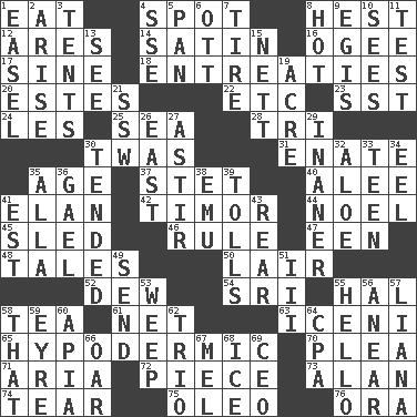 ACROSS 1. Ingest 4. Specific locale 8. Command 12. Ancient Greek god of war 14. Smooth fabric 16. Double curve, resembling the letter S 17. Trig term 18. Pleas 20. _____ Park, CO 22. And so on (abbr.) 23. Fast jet (abbr.) 24. French article 25. Ocean 28. Three (prefix) 30. It was, poetically 31. Related on the mother's side 35. Grow older 37. Proofreading order 40. Toward shelter 41. Liveliness 42. Southeast Indonesia island 44. Christmas carol 45. Downhill vehicle 46. General guideline 47. Car or cant ending 48. Falsehoods 50. Den 52. Morning condensation 54. _ Lanka 55. Actor Linden 58. Beverage made from leaves 61. Fish or hair follower 63. Ancient Celtic tribe of eastern Britain 65. Subcutaneous 70. Entreaty 71. Operatic vocal solo 72. Part 73. Actor Alda or Thicke 74. Rend 75. Margarine 76. Mouth or opening DOWN 1. Artist's stand 2. Originate 3. Portable shelters 4. Compass dir. 5. Baking dish 6. Baseball player Mel 7. Hoop that covers a wheel 8. Being at a high temperature 9. The front part of a cuirass 10. Observes 11. Trial 13. Perceive with the eye 15. Remaining after all deductions 19. Measure of real estate 21. Compass dir. 26. 90 degrees 27. Being in motion 29. More empty; more void 30. Looked after 32. _ vera 33. Adolescent 34. Snakelike fish 35. Silent film actress Nazimova 36. Highlander 38. Australian flightless bird 39. For Whom the Bell _____ 41. Eastern Standard Time (abbr.) 43. Hitchcock's "____ Window" 49. Post 51. One more than two 53. Shed a tear 55. Phone greeting 56. Approach 57. Climbing, woody, usually tropical vines 58. Not this but _ 59. Jane of fiction 60. Capital of Western Samoa 62. Musical group of three 64. Tax preparer (abbr.) 66. Rowing implement 67. Cartoonist voice _ Blanc 68. Frozen water 69. Corporate head (abbr.)
