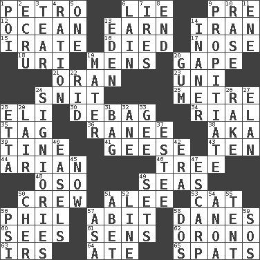 ACROSS 1. Stone: prefix 6. Untruth 9. Before (prefix) 12. Sea 13. Merit 14. SW Asia republic 15. Feeling or showing extreme anger 16. Passed on 17. Characteristic smell of wine 18. RI univ. 19. Not women's 20. Stare wonderingly 21. Northwest Algerian city 23. Corn or form start 24. In a ____ (agitated or irritated) 25. Distance measurement (Brit.) 28. Biblical high priest 30. Debunk (Brit. slang) 34. Monetary unit of Yemen 35. Label 36. Indian princess (variant) 38. Alias (abbr.) 39. Prong on a fork 41. Honkers 43. Nine, plus one 44. Believer in; advocate of (suffix) 46. Relationship diagram 48. Bear (Spanish) 49. Oceans 50. Group working together 51. Toward shelter 53. Feline 56. Silvers or Donahue 57. "This won't hurt ____!" 58. Natives or inhabitants of Denmark 60. Observes 61. Elected reps. 62. U. of Maine site 63. Big collection agency 64. Had dinner 65. Arguments over trivial matters DOWN 1. Luau course 2. Shade of tan 3. Pull apart 4. Food allowance for one day 5. Single 6. (Had) reclined 7. Angers 8. Conclusion 9. Conciliate 10. To erase 11. Compass dir. 13. Paradise 14. More empty; more void 19. Mother 20. Chewing product 22. To free from 24. Seigniories (variant) 26. Libertine 27. Style 28. Singer James 29. Den 31. Container for groceries 32. A saturated hydrocarbon 33. Unit of force equal to gravity 37. First name in cosmetics 40. Artist's stands 42. Period 45. At this time 47. Fortification 49. Arranges properly for use 50. "Mermaids" star 51. Collude with 52. Actor's bit 54. Small Philippine buffalo 55. Portable shelter 56. 23rd letter of the Greek alphabet 57. White ___ sheet 58. Two (Sp.) 59. Mayday