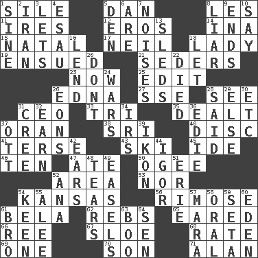 ACROSS 1. Drop; flow; fall 5. One of the 12 tribes of Israel 8. French article 11. Angers 12. Greek god of love 14. _ tizzy (2 wds.) 15. Relating to or accompanying birth 17. Famous astronaut Armstrong 18. Kenny Rogers chart-topper in '80 19. Took place subsequently 21. Spring feasts 23. Immediately 25. Prepare for publication 26. Pulitzer Prize-winning author Ferber 27. Compass dir. 28. Perceive with the eye 31. Corporate head (abbr.) 33. Three (prefix) 35. Started a card game 37. Northwest Algerian city 38. Indian title of respect (Mr.) 40. Flat circle 41. Laconic 43. What Jean-Claude Killy likes to do 45. Binary compound 46. Nine, plus one 47. Had dinner 50. Double curve, resembling the letter S 52. Length times width 53. And not 54. Sunflower state 56. Full of chinks, cracks, or crevices 61. Actor Lugosi 62. Confederate soldiers (slang) 65. Having ears or earlike features 66. Portuguese money of account (variant) 67. _ gin 68. Assign a rank or rating to 69. Single 70. Manchild 71. Actor Alda or Thicke DOWN 1. Trig term 2. SW Asia republic 3. Allows 4. Son of Isaac 5. Lair 6. "We ___ not amused" (Victoria) 7. Annoying sounds 8. One who doesn't tell the truth 9. Extremities 10. Declare 13. Bobsleighs 16. Grant temporary use of 18. Allow 20. Do not 22. Passed on 24. Armed conflicts 26. Immeasurably long periods of time 28. Alleged 29. Otherwise 30. And so on (abbr.) 31. Algonquian 32. Merit 34. Big collection agency 36. Singer Brickell 37. Baseball player Mel 39. Picture 42. Hearing organs 44. Composer Stravinsky 48. Lacerates 49. Artist's stands 51. 4th largest of the Great Lakes 52. Santa ___, CA 54. Peachy ____! 55. Toward shelter 57. Hindu Mythology: god of death 58. Taken by mouth 59. Bristle 60. Genesis locale 61. Sis' sibling 63. Surprise greeting 64. Elected rep.